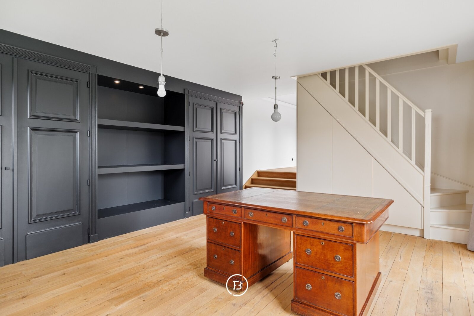 0: inkomhal met gastentoilet, woonkamer, volledig uitgeruste keuken en eetkamer voorzien van gashaard en wijnfrigo. Verder is het gelijkvloers voorzien van een apart bureau met ingemaakte kasten met boven de bureau een slaapkamer met douchekamer.