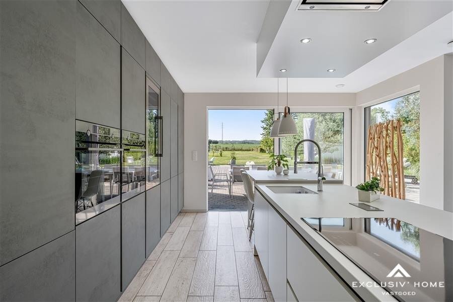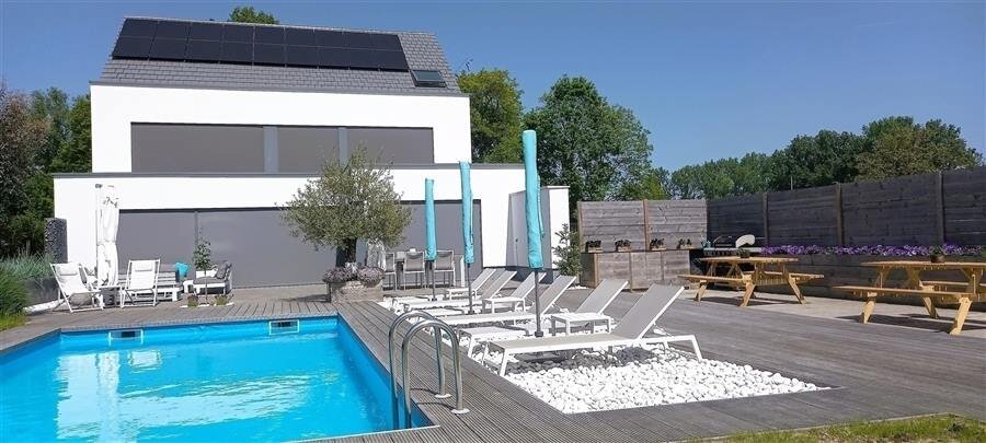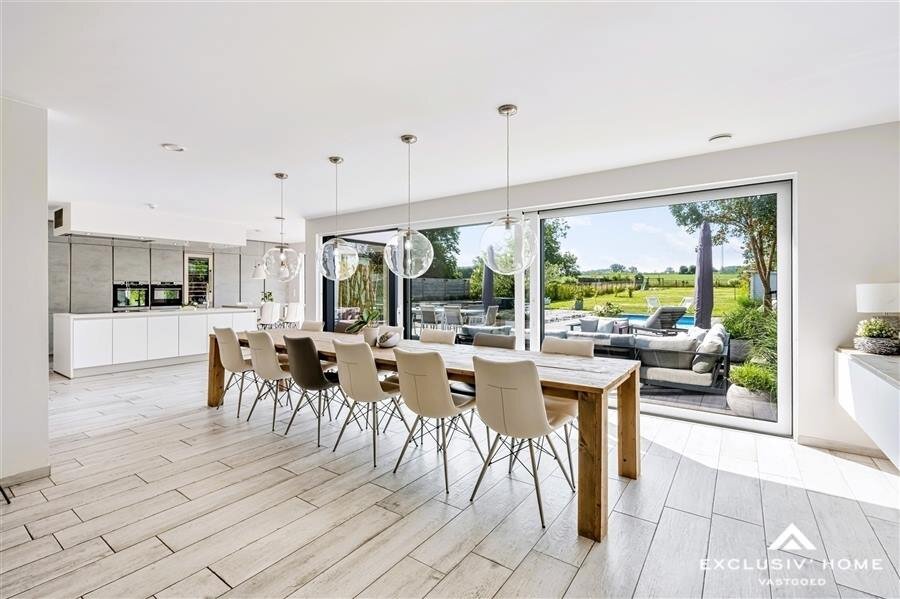 From all living spaces, you can enjoy stunning views of the inviting terrace, the heated swimming pool, and the expansive garden, which seamlessly blends into the meadows and fields beyond. The location, near the Raspaillebos forest and the recreational domain “De Gavers”, makes this villa the perfect retreat for those who appreciate peace, nature, and outdoor living.