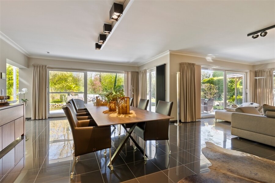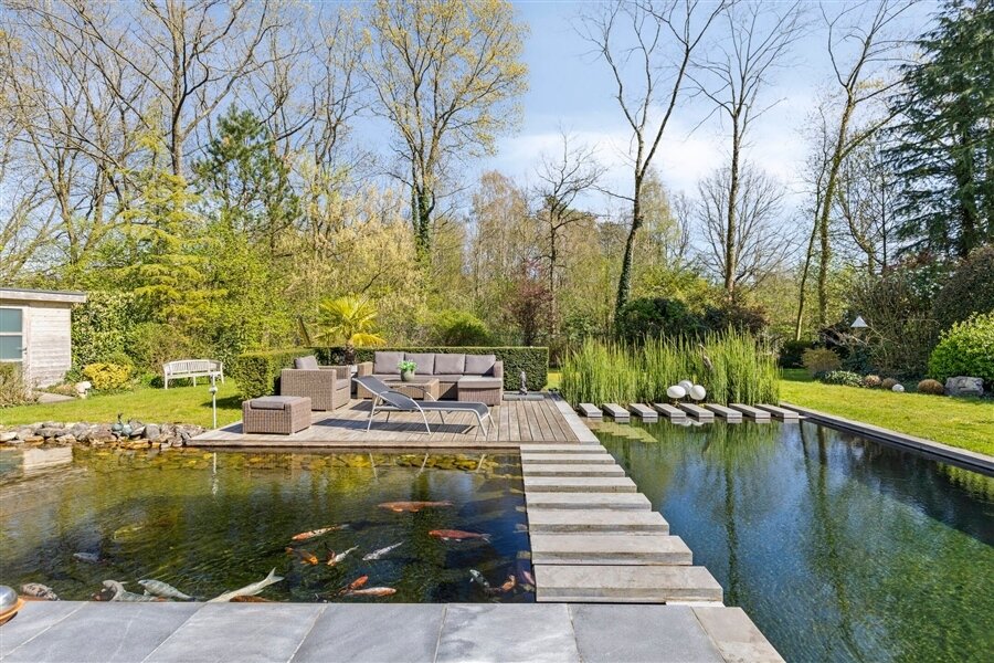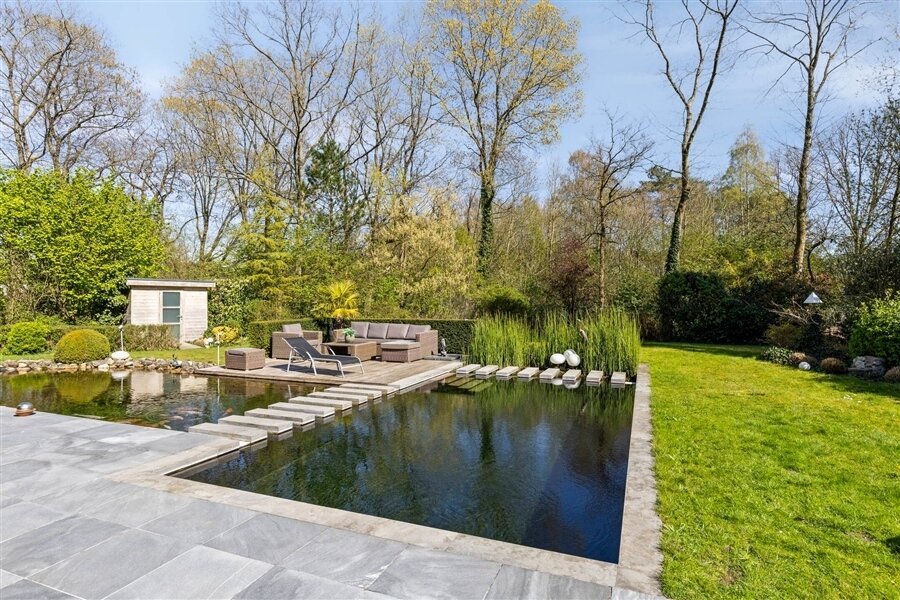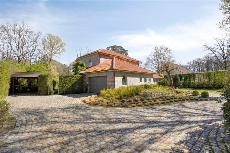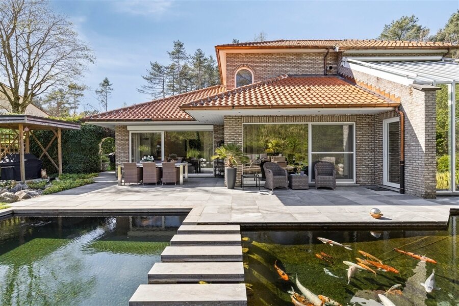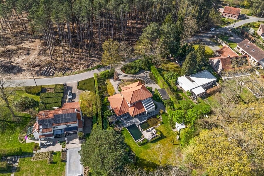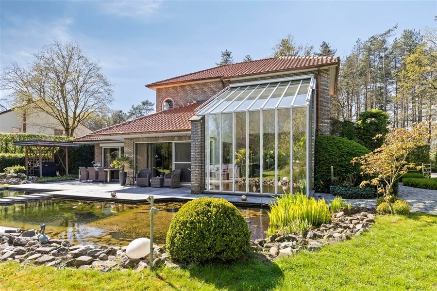 In the middle of a lush oasis of calm, in a child-friendly and serene living environment, near the Abbey of Averbode, we are honored to offer for sale this spacious and prestigious Romanesque villa. This perfectly maintained property with a usable area of no less than 259 m² and situated on a perfectly oriented plot of 2196 m² is extremely quietly situated in a beautiful wooded area and close to all major roads. This spacious and ready-to-use villa comprises on the ground floor a spacious entrance hall with checkroom and guest toilet, an office/bedroom, a spacious garage and a practical laundry/storage room. In addition, this gem on the ground floor comprises a majestic living space of approximately 75 m² with an adjacent open-plan luxury bespoke kitchen, which in turn provides access to the sun-drenched rear garden, where a permanent vacation feeling reigns. On the second floor, this property boasts 2 full-size bedrooms, a separate toilet and a fully equipped bathroom. The presence of a beautifully landscaped garden with impressive driveway, spacious terraces, a garden shed and a beautiful pond with separate large swimming area, make this prestige villa a unique dream home! In short, this high-quality finished property in a rural and child-friendly environment, near Averbode Forest and Heath, is definitely worth your visit. A unique and not to be missed opportunity!