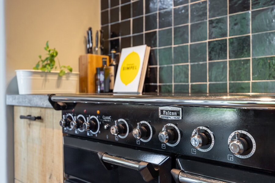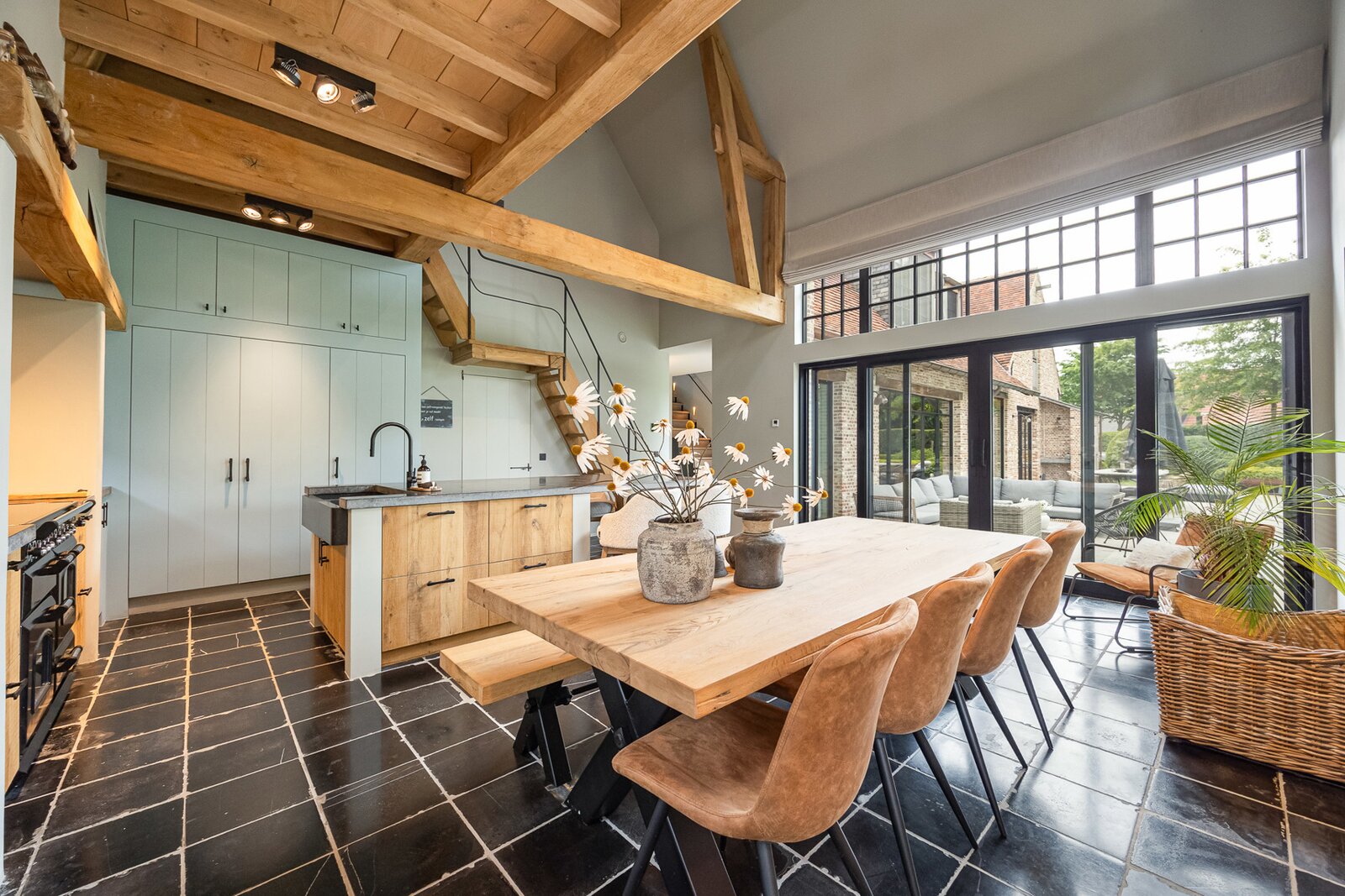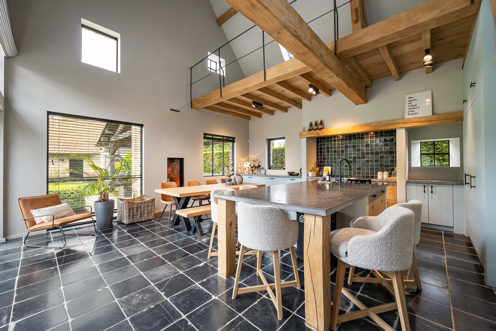 De royale leef-eetkeuken van 49 m² is zonder twijfel het kloppende hart van deze woning. Hier koos men voor handgetrommelde, gezoete Belgische blauwe hardsteen, gecombineerd met een indrukwekkende mezzanine van 15 m² in volle eik.