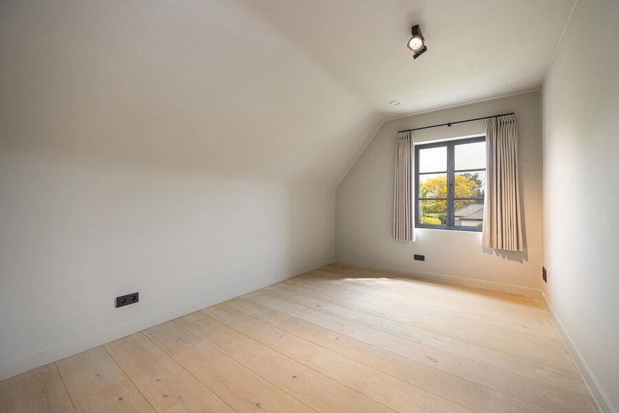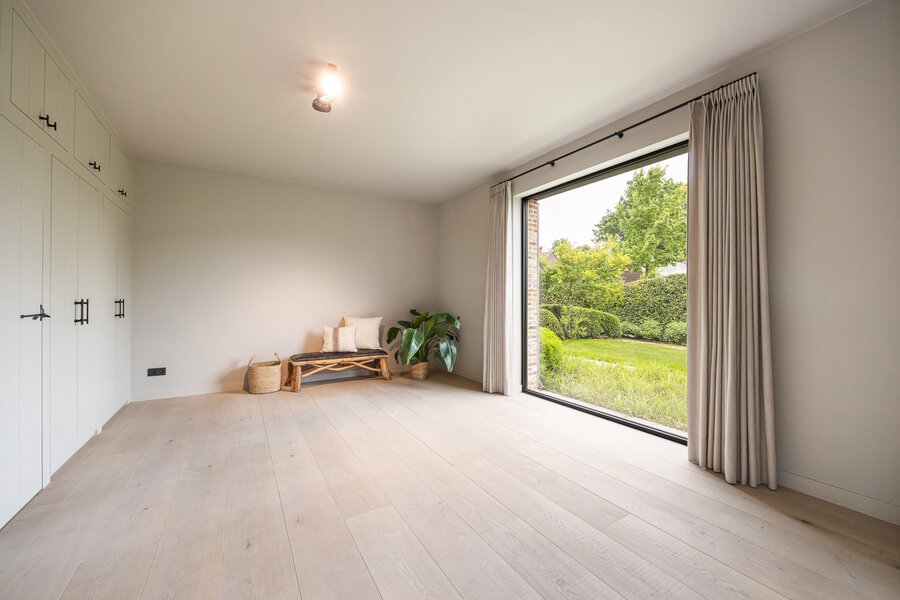 De hoofdslaapkamer van 22 m² geeft een uniek uitzicht op de aangelegde tuin en grenst aan een ensuite dressing van 19 m², eveneens op parket.