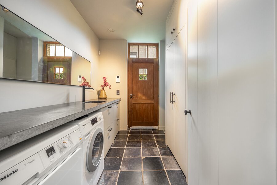 De wasplaats van 8 m² met een werkblad in handgetrommelde, gezoete Belgische blauwe hardsteen is eveneens praktisch ingericht met inbouwkasten én is voorzien van aansluitingen voor wasmachine en droogkast.