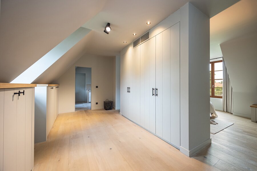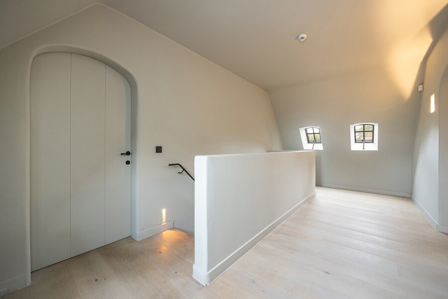 De royale overloop van 30 m² op parket leidt naar het mastergedeelte, een apart nachttoilet en verschillende kamers.
