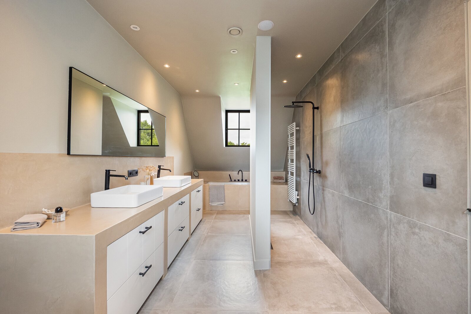 De ensuite badkamer van 19 m² op tegel met ligbad, ruime inloopdouche, dubbel lavabomeubel, spiegel en toilet combineert comfort en design en werden afgewerkt met microcement (Coprox).