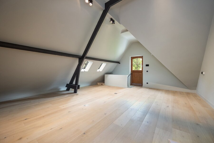 De bureauruimte van 27 m², afgewerkt met massieve eiken planken biedt de perfecte omgeving voor wie wonen en werken wil combineren.