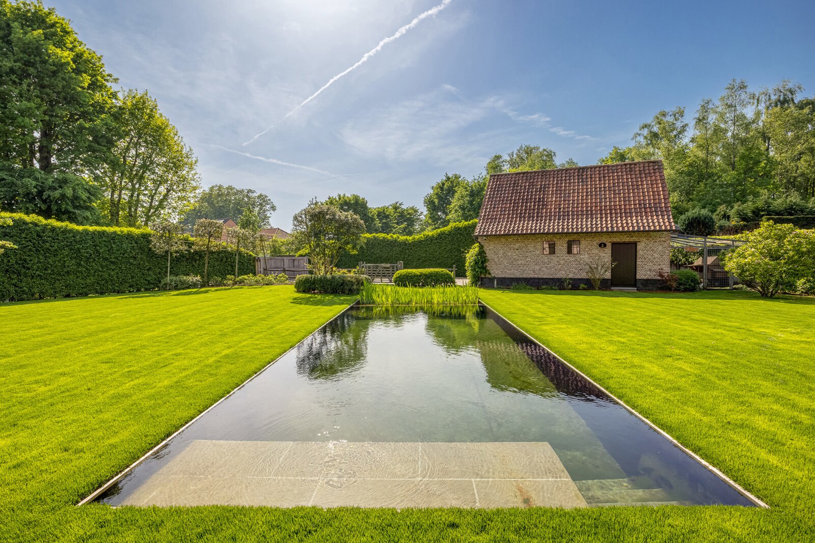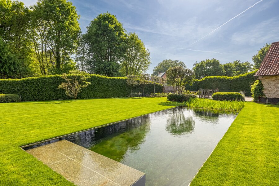 Het pronkstuk van de tuin is uiteraard de natuurlijke zwemvijver met hoogwaterlijn en biologisch filterysteem.