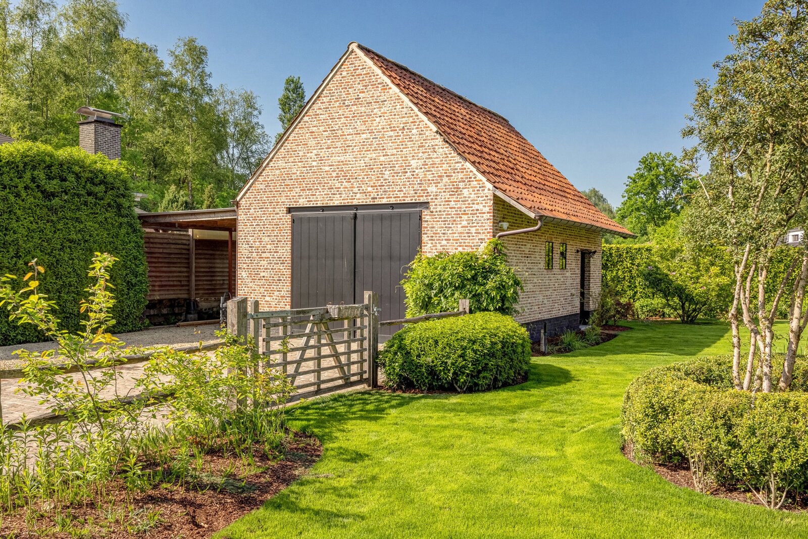 De Poolhouse/garage van 44 m² werd vervaardigd in dezelfde afwerkingsgraad als de woning en is toegangkelijk via een aparte oprit in kasseien met automatische toegangspoort.