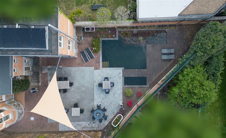 A private oasis awaits around the villa. An attractive garden and sunny terrace with swimming pond form an inviting outdoor space, while 10 on-site parking spaces guarantee convenience and exclusivity.
