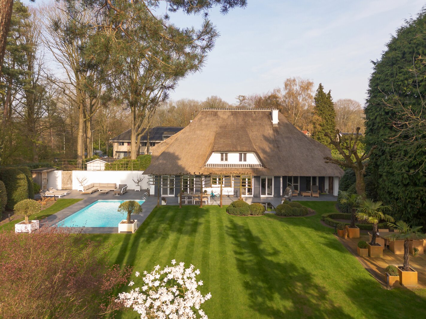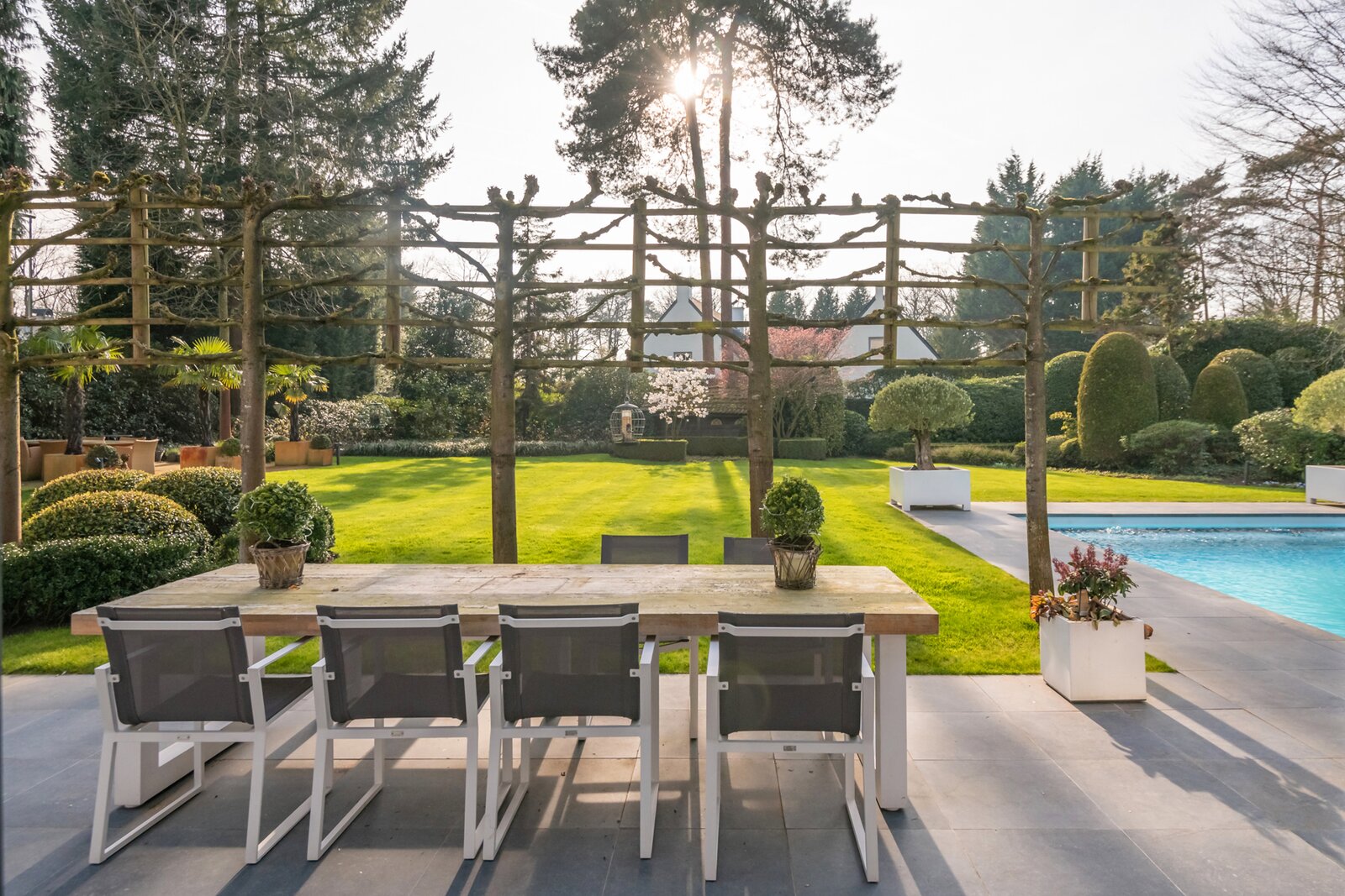 De zonnige tuin werd met de grootste zorg aangelegd met een vernieuwd terras (2022), een verwarmd zwembad met lounge en buitendouche en een koivijver.