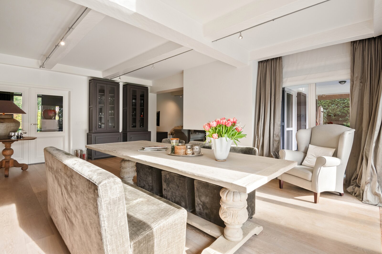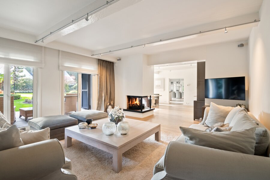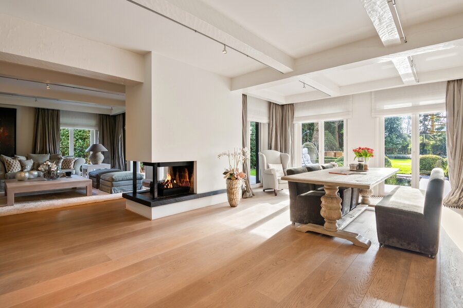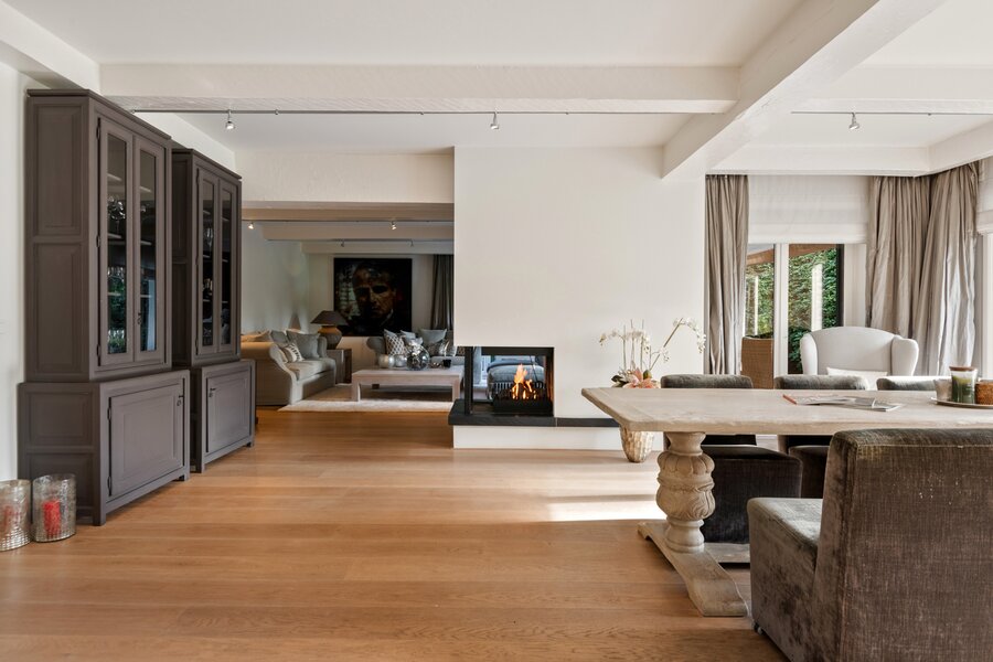 De entree geeft uit op de royale leefruimte op parketvloer. De living is ingedeeld in een gezellige zithoek en een eetkamer. Een sfeervolle gashaard vormt hierbij een centraal element tussen beide ruimtes.