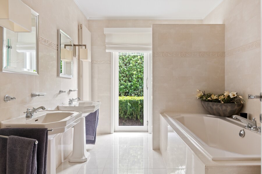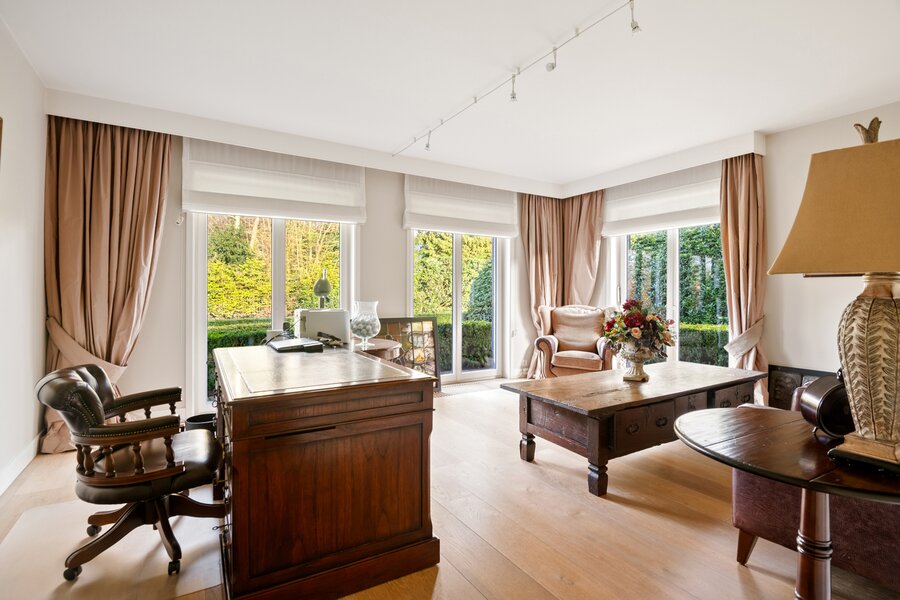 Links van de inkomhal komen we in een kantoor (eventueel gelijkvloers slaapkamer) met aansluitende badkamer die is voorzien van een ligbad, inloopdouche, dubbele lavabo en een toilet.