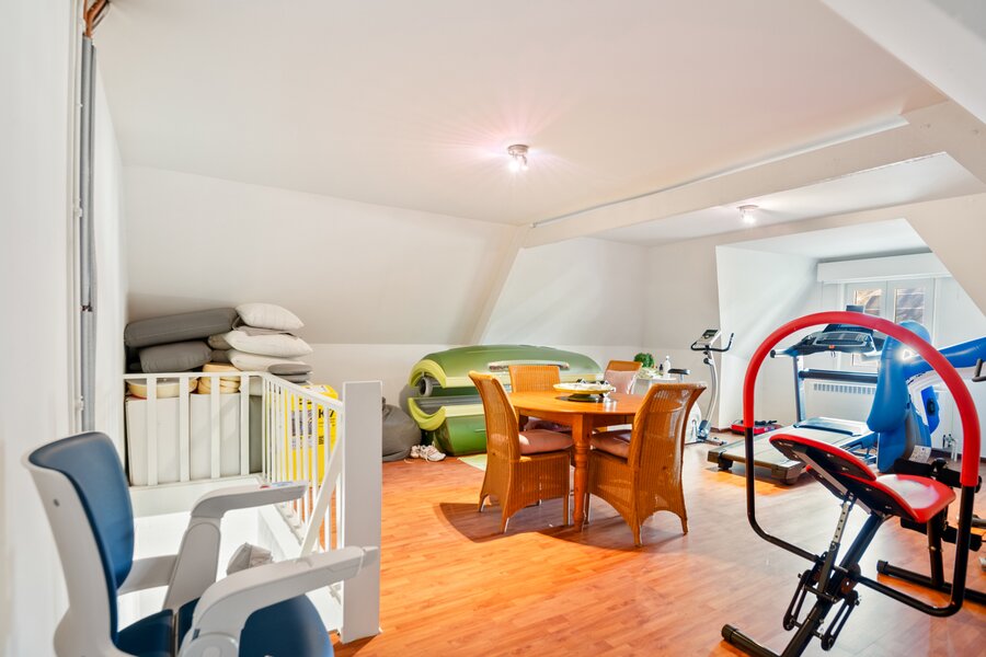 Van hieruit is er toegang tot de dubbele garage met automatische toegangspoorten en een trap die (met traplift) leidt tot de fitnessruimte op de eerste verdieping.