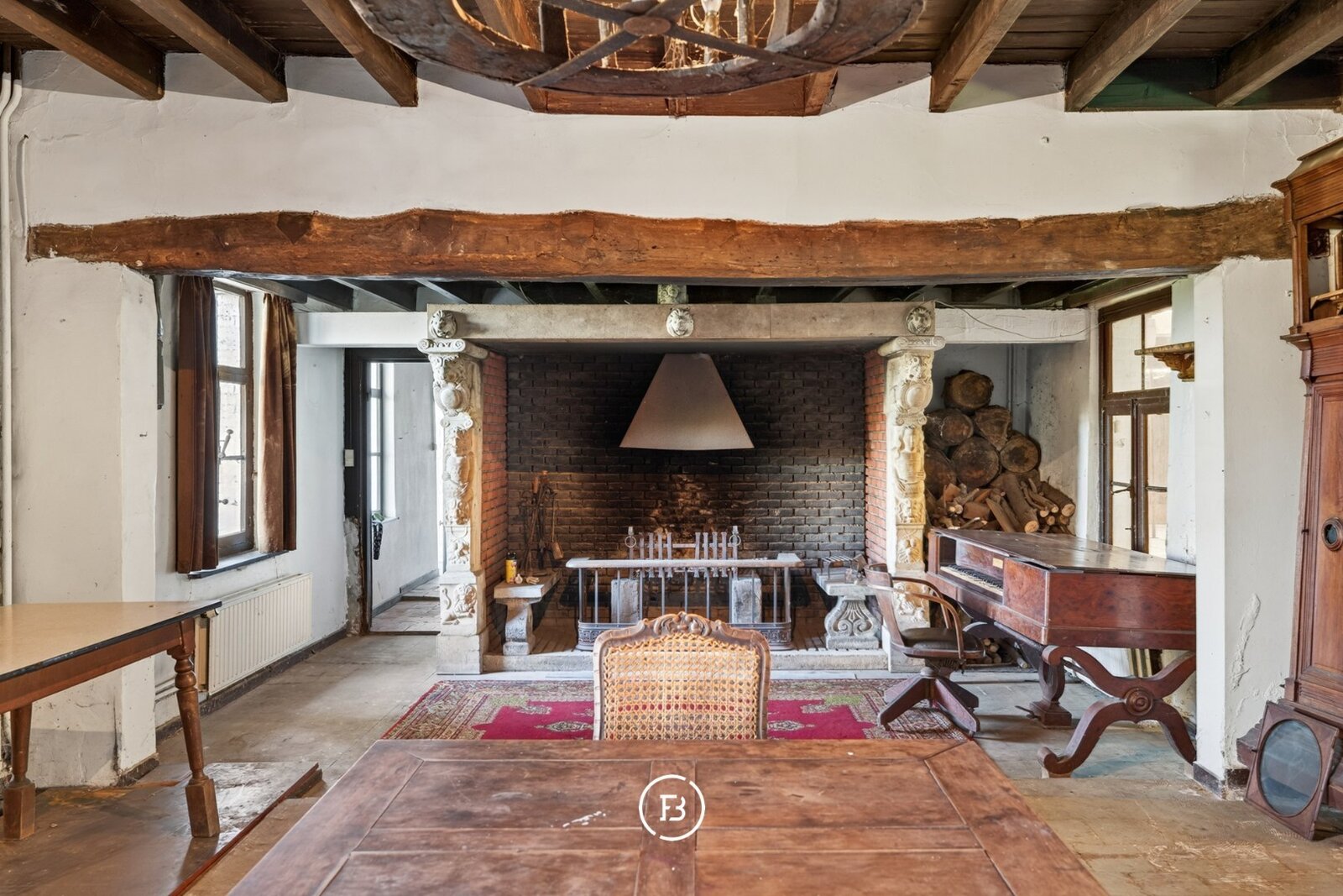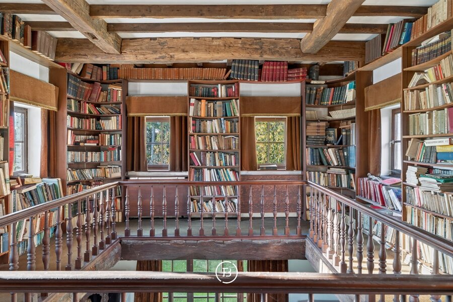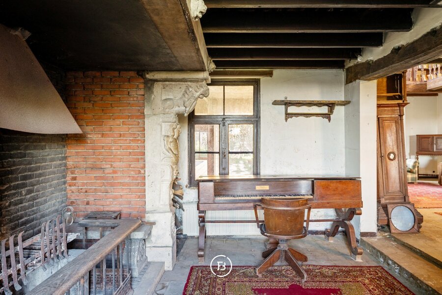 De huidige indeling omvat een inkomhal met toegang tot de ruime dubbele garage, een sfeervolle woonkamer met open haard en een prachtig doorkijk naar de bibliotheek in de toren, een apart toilet, een keuken met aansluitende berging en een grote eetplaats.
