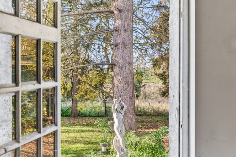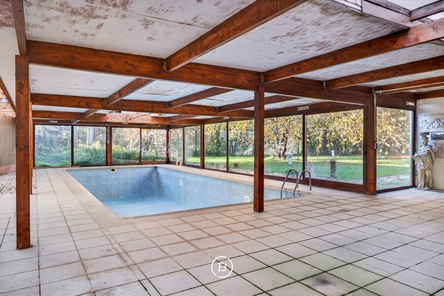 Achteraan de woning bevindt zich een binnenzwembad dat uitgeeft op de tuin met zicht op het achterliggende weilanden. Extra troeven zijn het bijgebouw, de absolute privacy in de tuin en de mogelijkheid tot vrij beroep of kangoeroewoning.