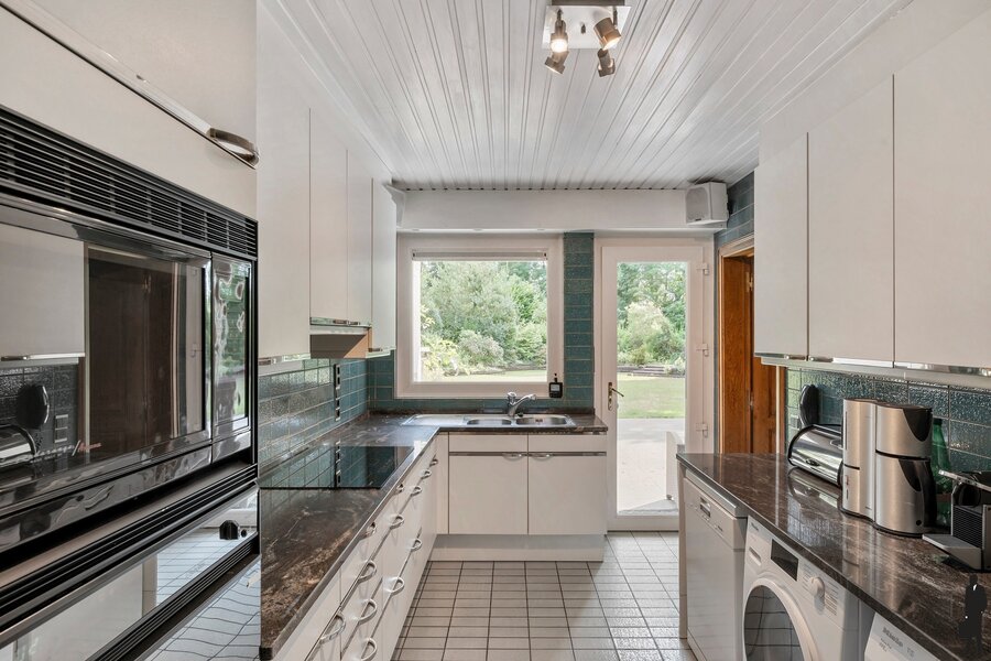 - Een gesloten keuken met dubbele gootsteen, inductiekookplaat, oven, microgolf, vaatwasser, aansluitingen voor wasmachine en droogkast, en toegang tot de tuin
