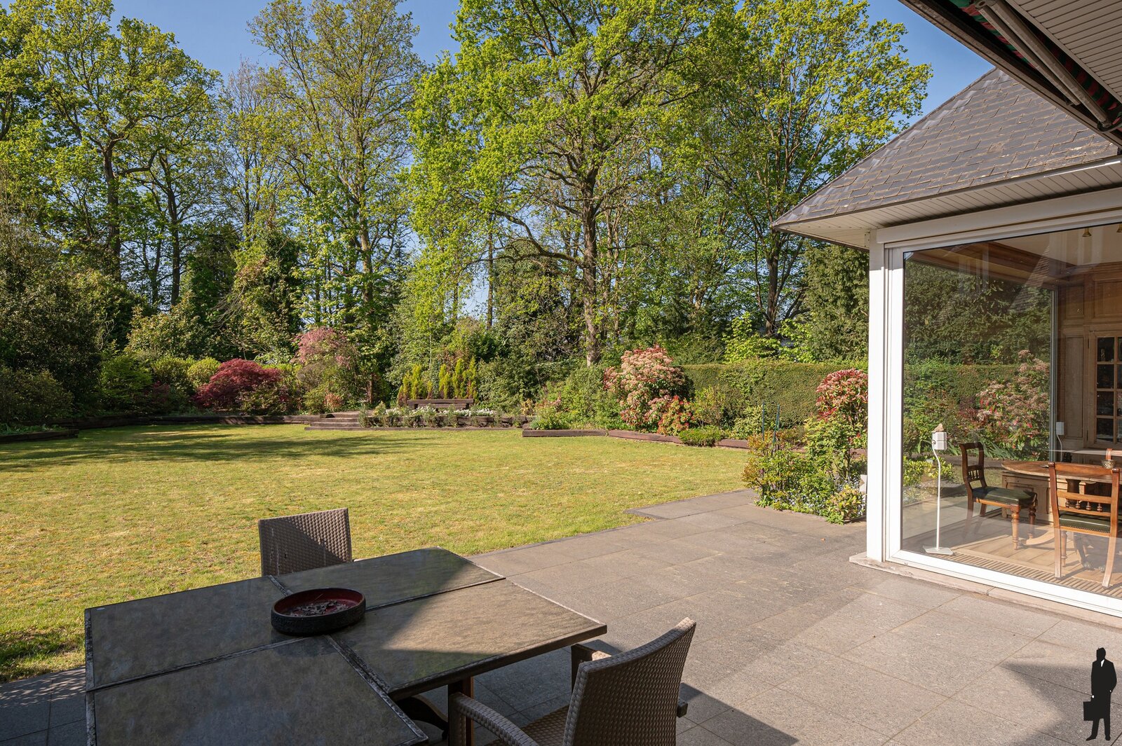 - Een achterliggende wintertuin/tuinkamer met plafondhoge ramen, veel lichtinval en prachtig zicht op het groen, eveneens op parketvloer