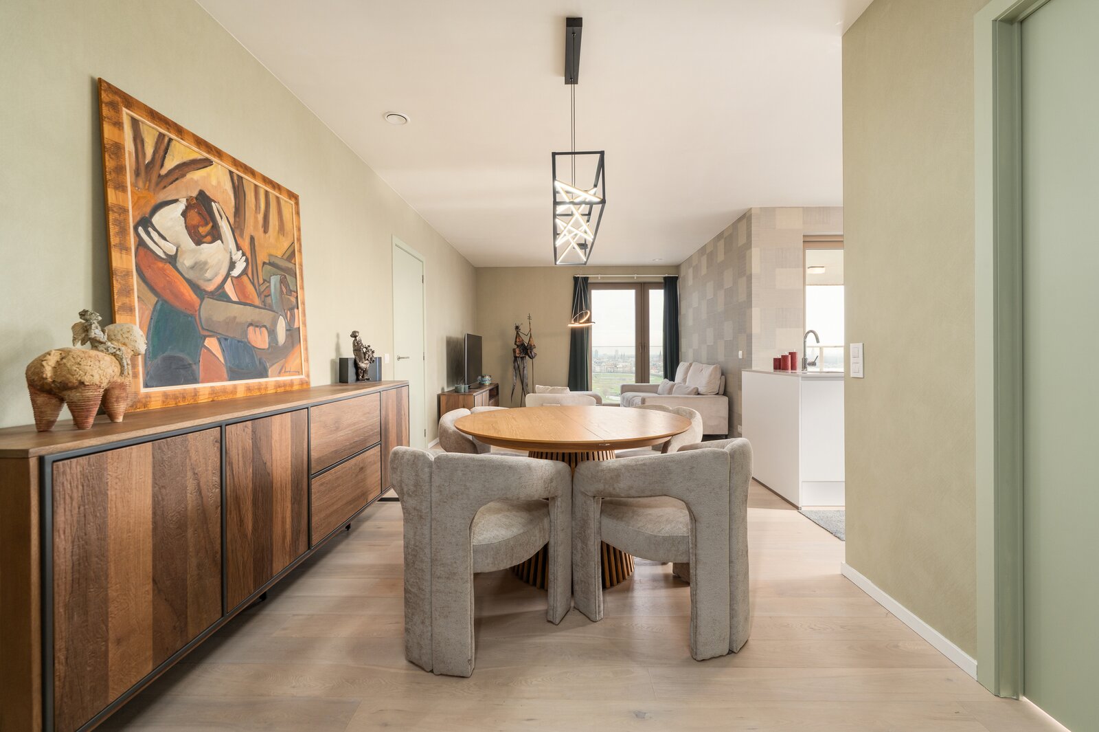 Open living space finished with high-quality materials. Modern kitchen with dishwasher, microwave, oven, induction hob and gas oven.