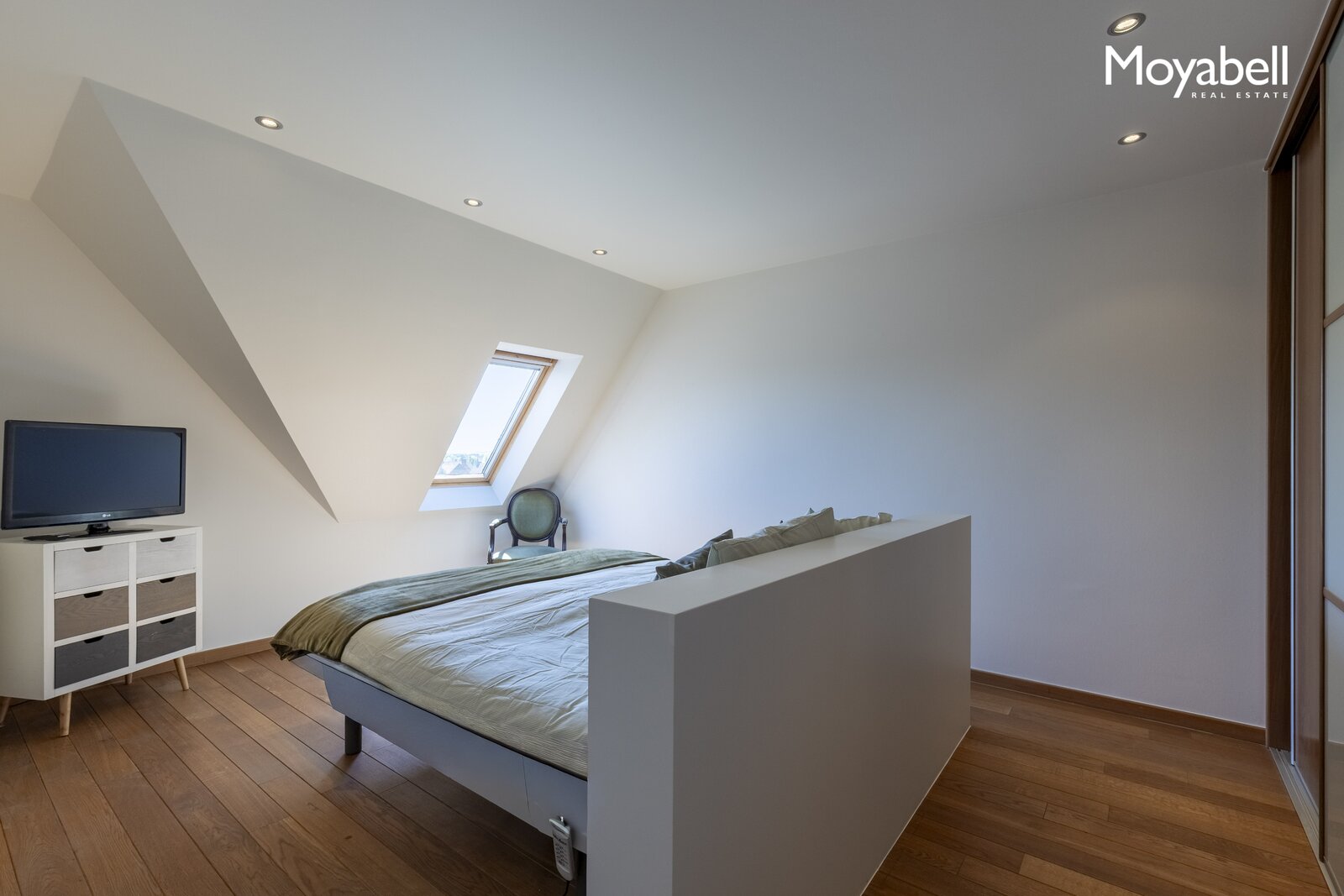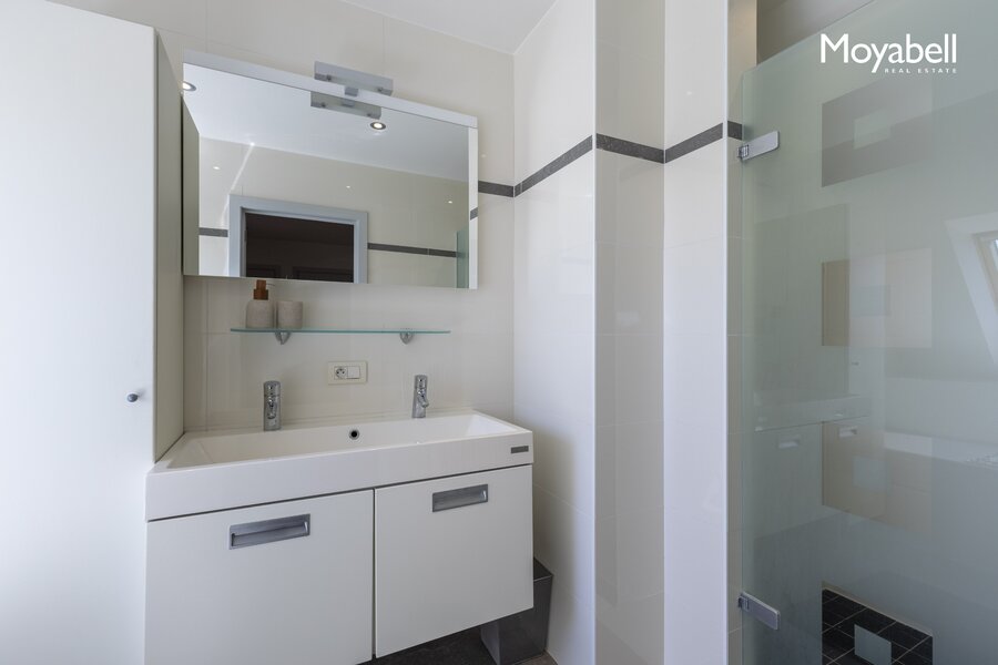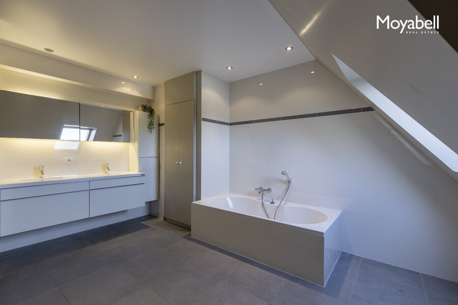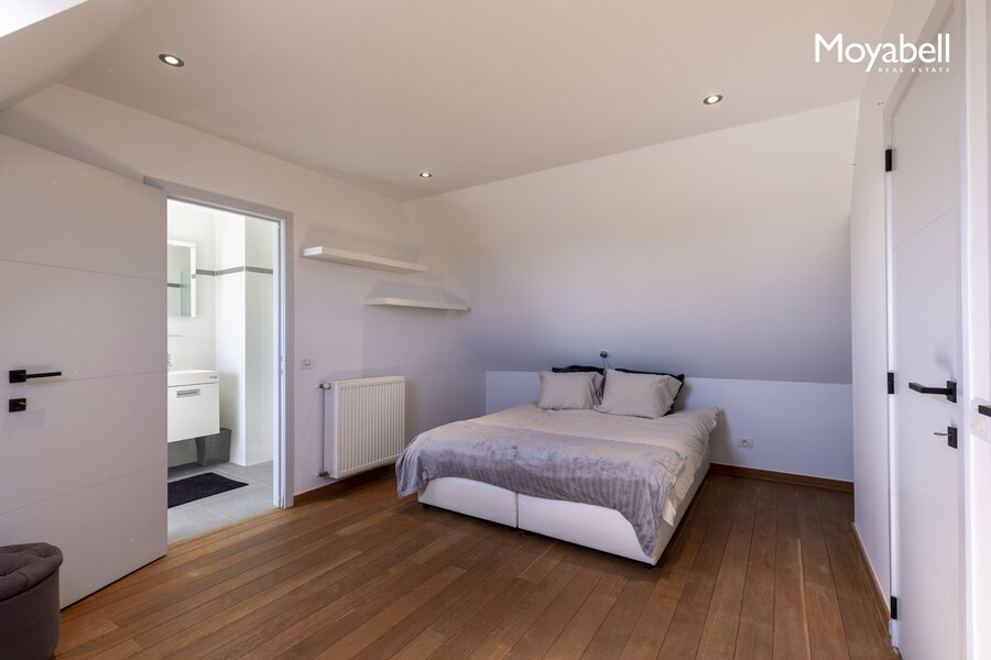 De bovenste verdieping biedt een zeer ruime polyvalente ruimte met eigen douche en apart toilet, ideaal als extra slaapkamer, bureau, fitnessruimte of dressing.