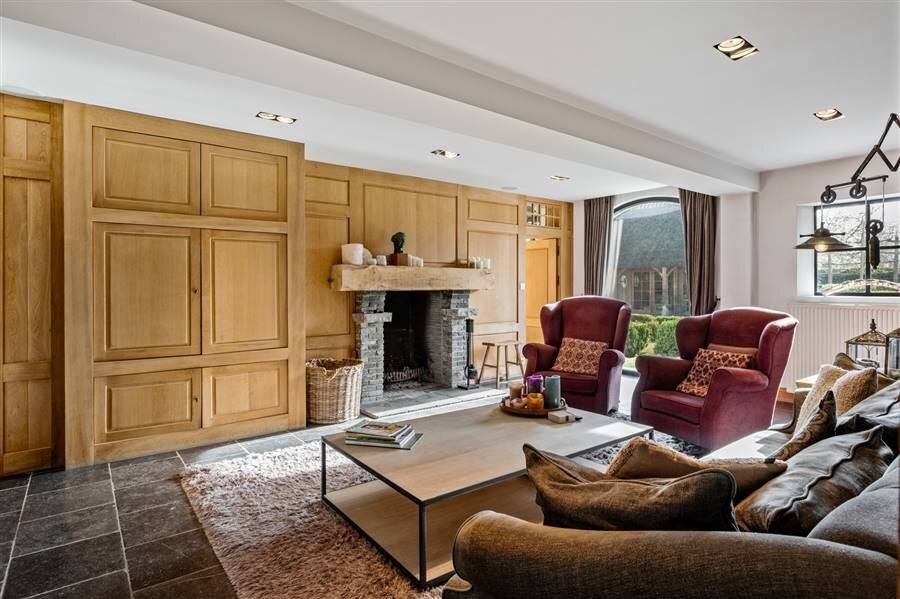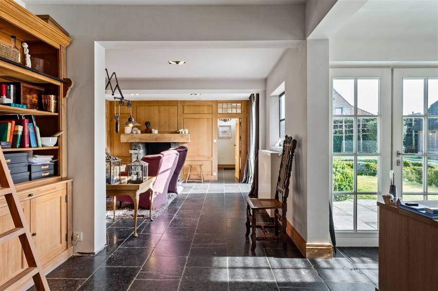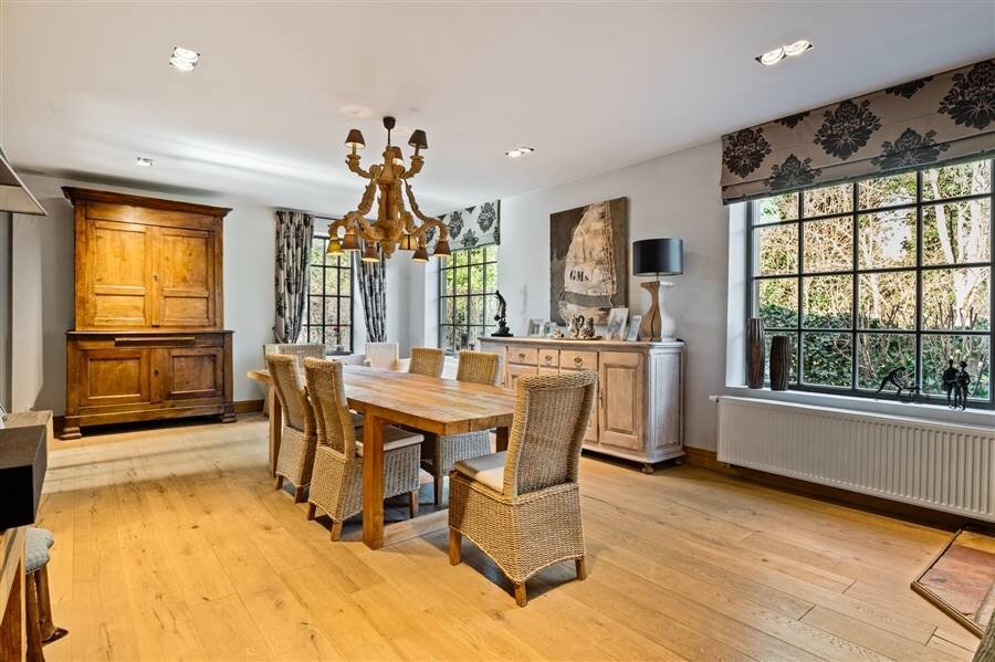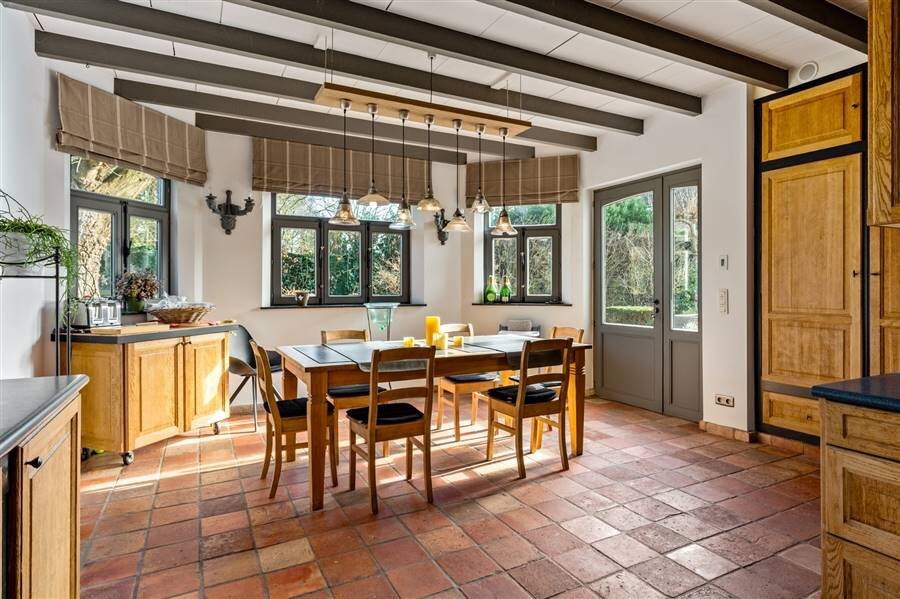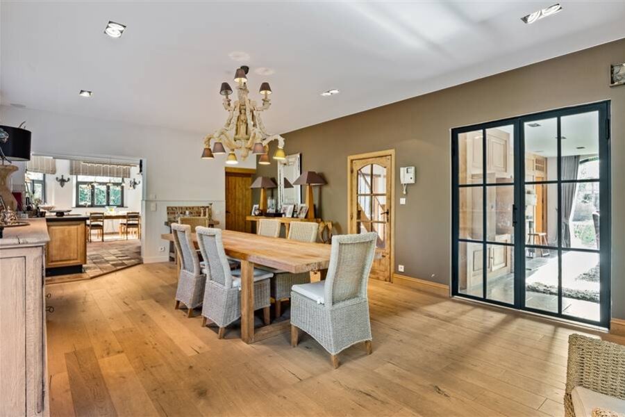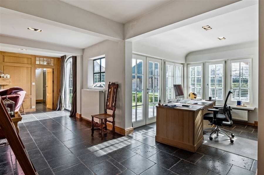 Het gelijkvloers omvat een inkomhal met toilet en vestiaire, multifunctionele ruimte, sfeervolle woonkamer met haard en maatkasten, bureau met bibliotheekkast, eetkamer en een volledig ingerichte keuken met vloerverwarming en prachtig zicht op het zwembad. Verder zijn er een wasplaats, inpandige dubbele garage met zolderruimte en een aparte werkplaats.