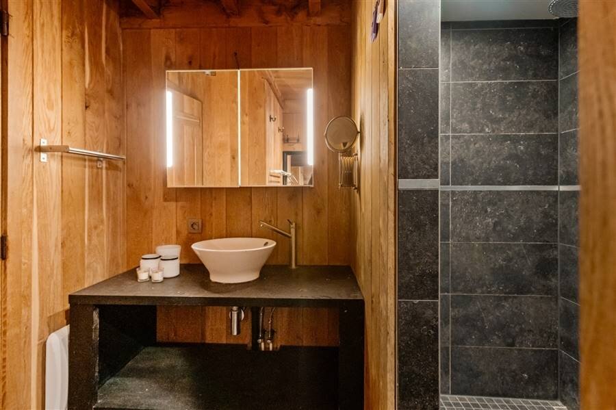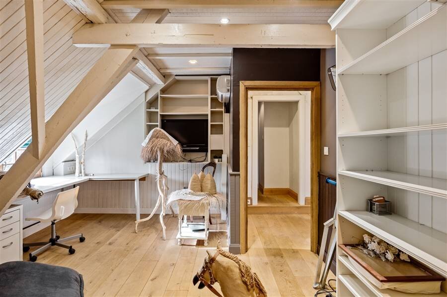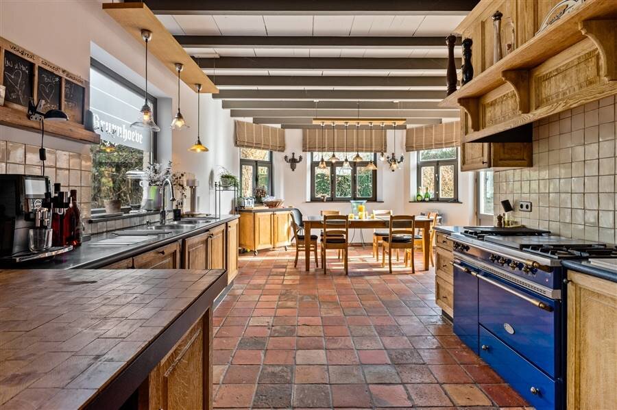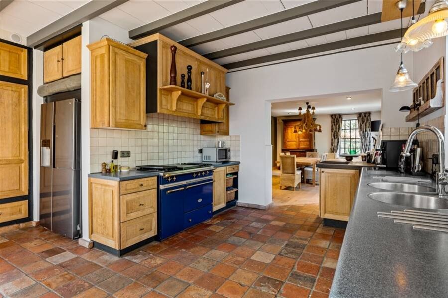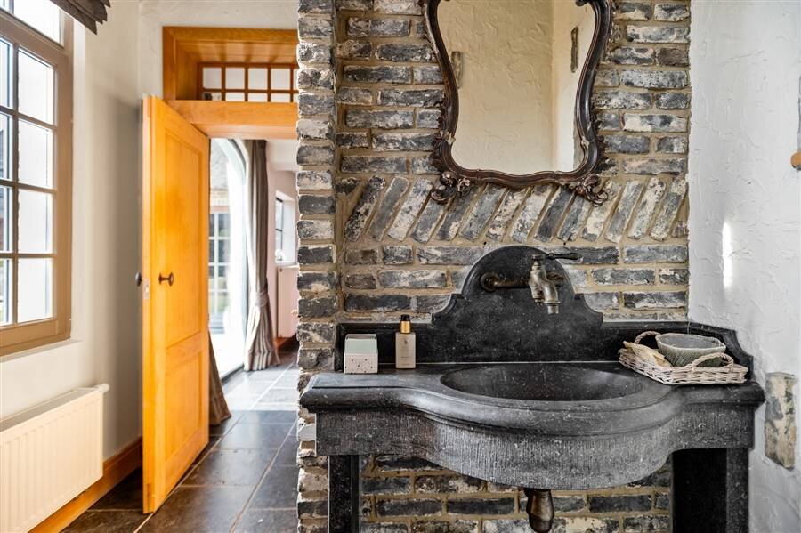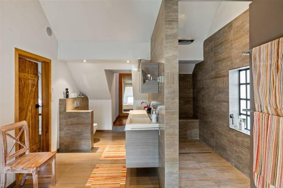 Het gelijkvloers omvat een inkomhal met toilet en vestiaire, multifunctionele ruimte, sfeervolle woonkamer met haard en maatkasten, bureau met bibliotheekkast, eetkamer en een volledig ingerichte keuken met vloerverwarming en prachtig zicht op het zwembad. Verder zijn er een wasplaats, inpandige dubbele garage met zolderruimte en een aparte werkplaats.