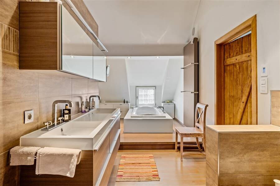Op de eerste verdieping geeft de ruime nachthal toegang tot vier slaapkamers. De master beschikt over een inloopdressing en extra dressing, met aansluitend een luxueuze badkamer (ligbad, inloopdouche, dubbele lavabo, toilet en ingebouwde muziekinstallatie). Daarnaast is er een tweede douchekamer.
