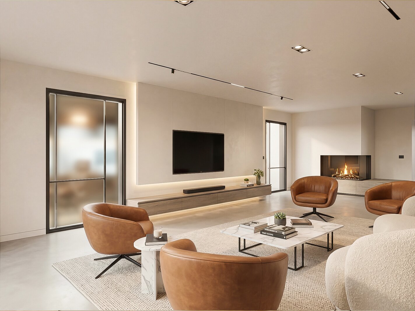 - Bureau (14,53m²): maatkasten met bureau, TV- en internetaansluiting, pivoterende deur, muziekinstallatie, keramische tegelvloer.