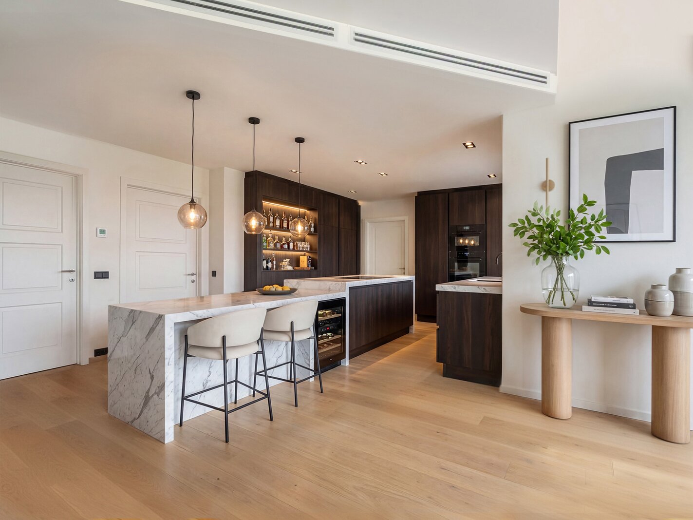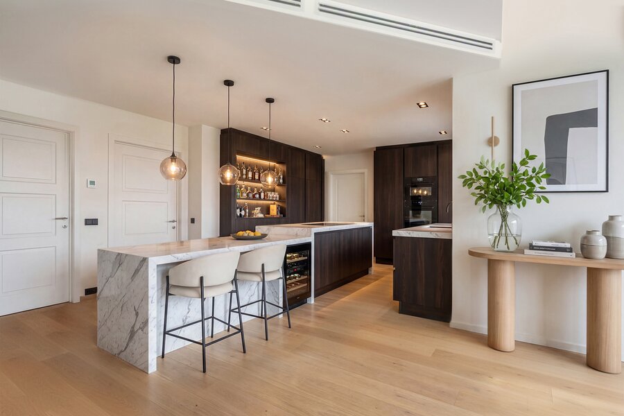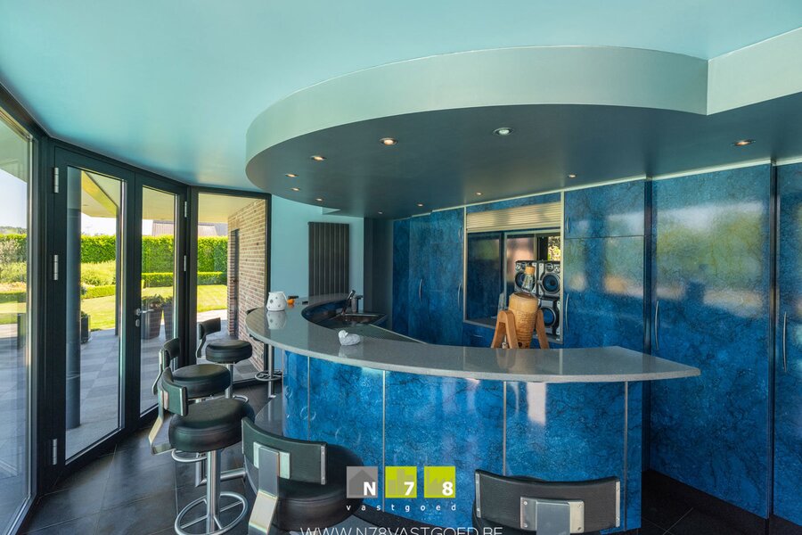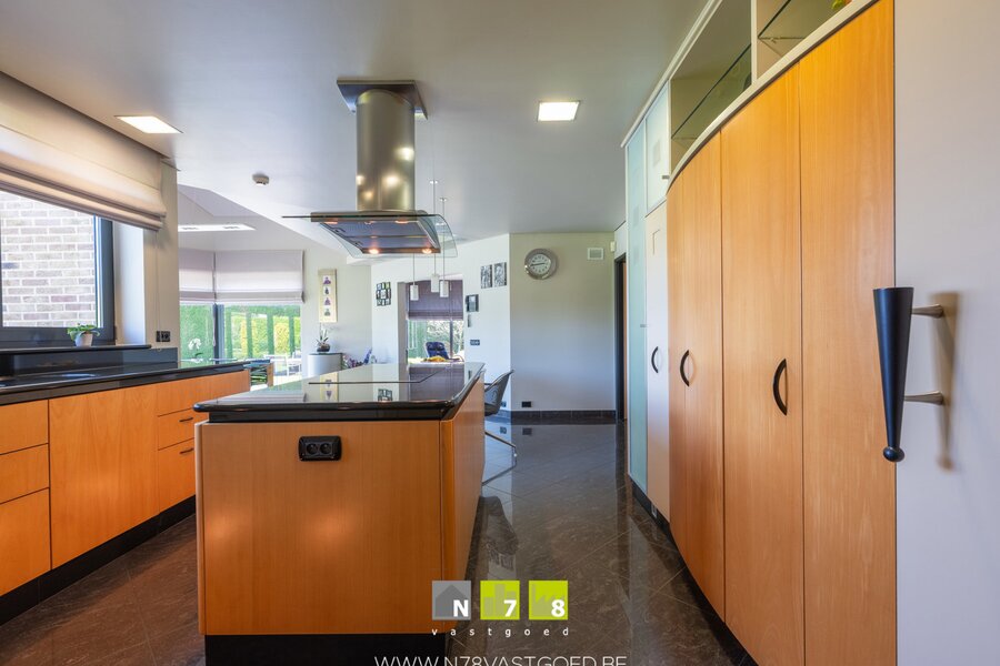 - Keuken (27,49m²): volledig ingerichte keuken, afgewerkt met natuurstenen werkblad en een praktische eethoek, uitgerust met volgende toestellen: dubbele spoelbak met kraanwerk, dampkap, oven, microgolf, inductiekookplaat, vaatwasser en koelkast (alle apparatuur van Miele), ingebouwde airco, keramische tegelvloer.