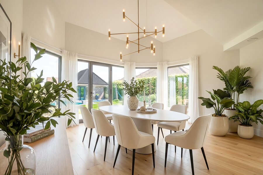 - Eetkamer (18,87m²): prachtig zicht over de achtertuin, keramische tegelvloer.