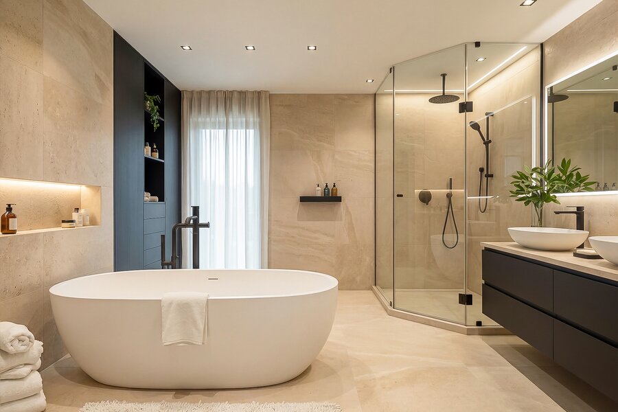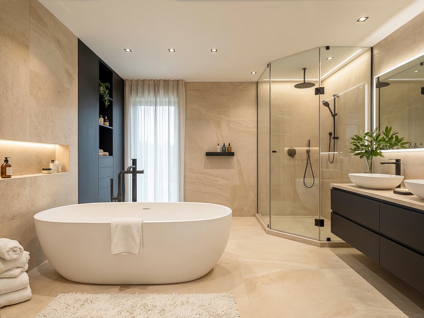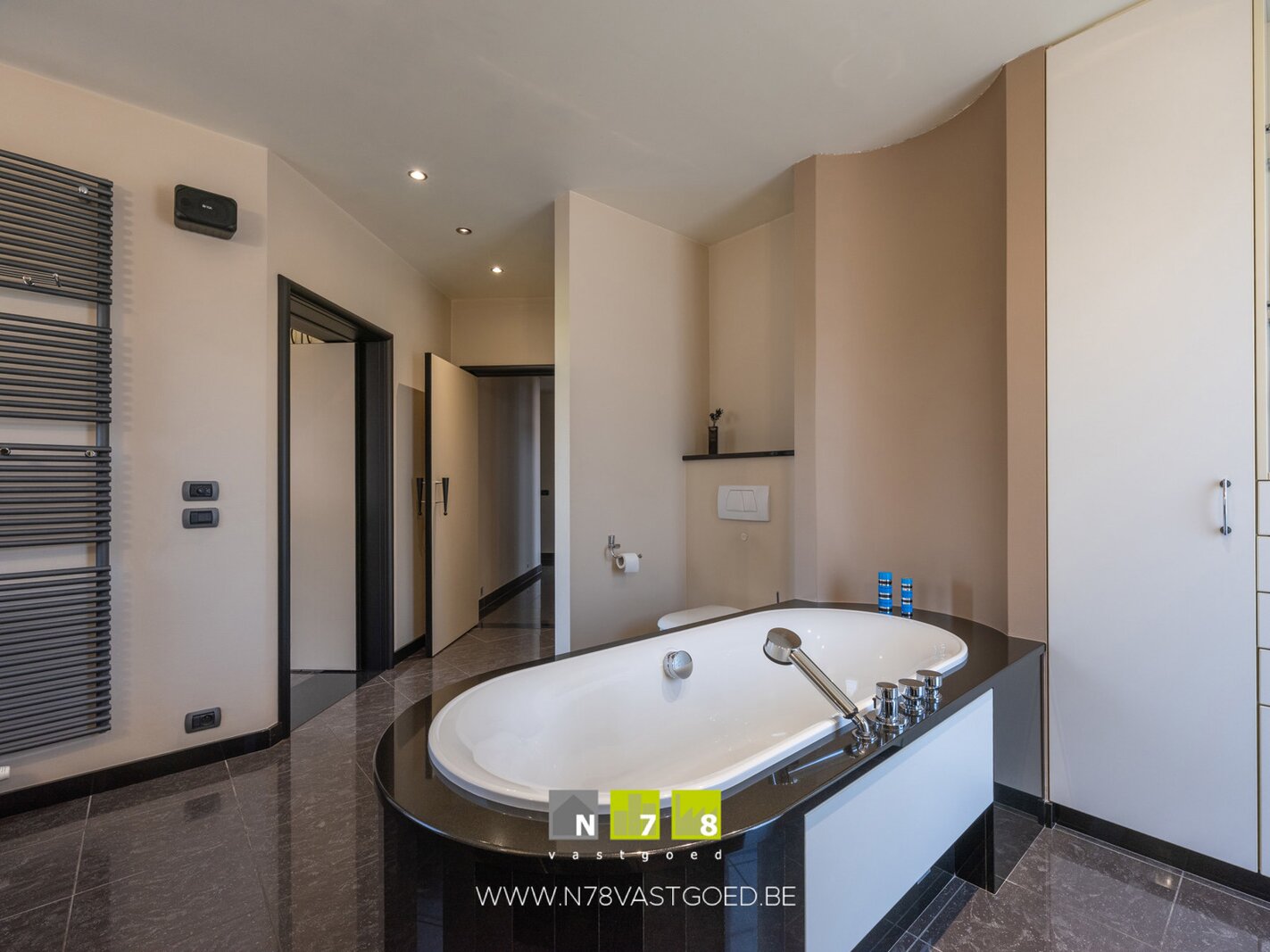 - Badkamer 1 (18,50m²): ligbad, stoomdouche, hangtoilet, 2 afzonderlijke lavabo's met maatkasten, natuurstenen afwerking, sierradiator, muziekinstallatie, keramische tegelvloer.