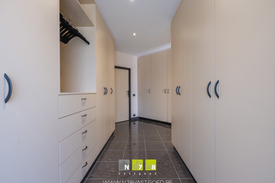 - Dressing (22,33m²): volledig ingerichte dressing met leggers, hangers,..., elektriciteitskast, keramische tegelvloer.