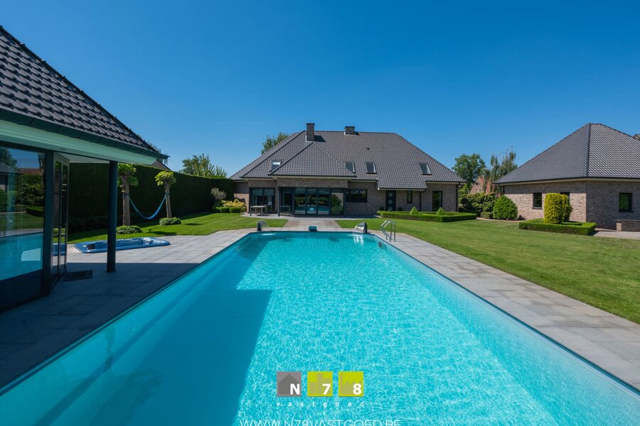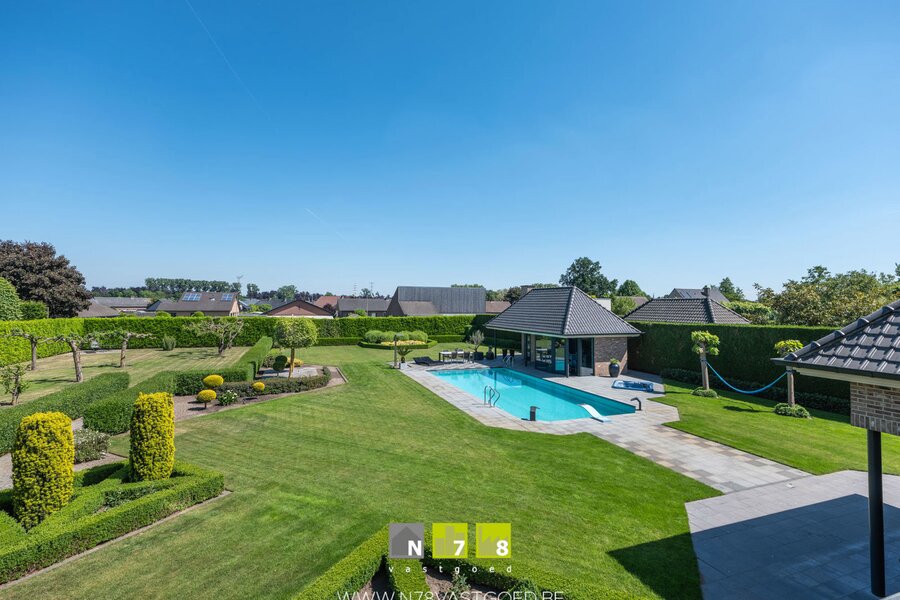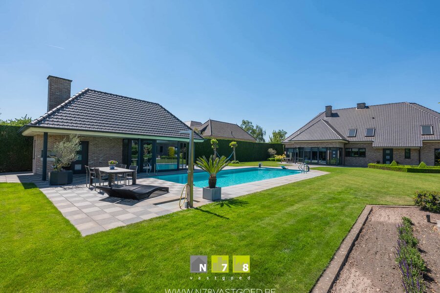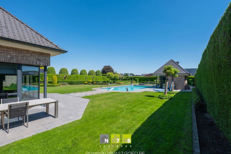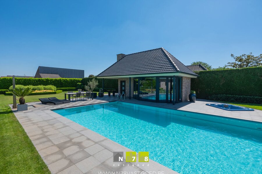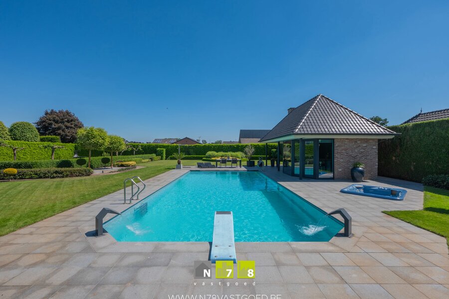 INSTAPKLARE VILLA MET 4 SLAAPKAMERS, 3 DUBBELE (VRIJSTAANDE) GARAGE, PRACHTIGE TUIN MET VERWARMD ZWEMBAD, JACUZZI EN POOLHOUSE OP 32A09CA TE BREE.