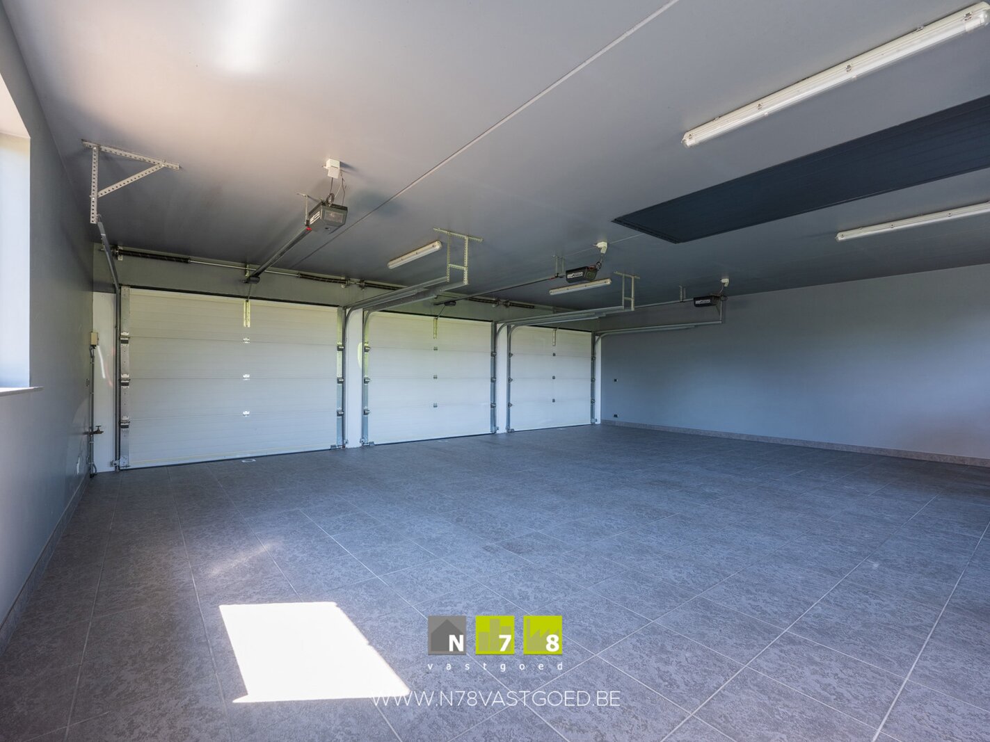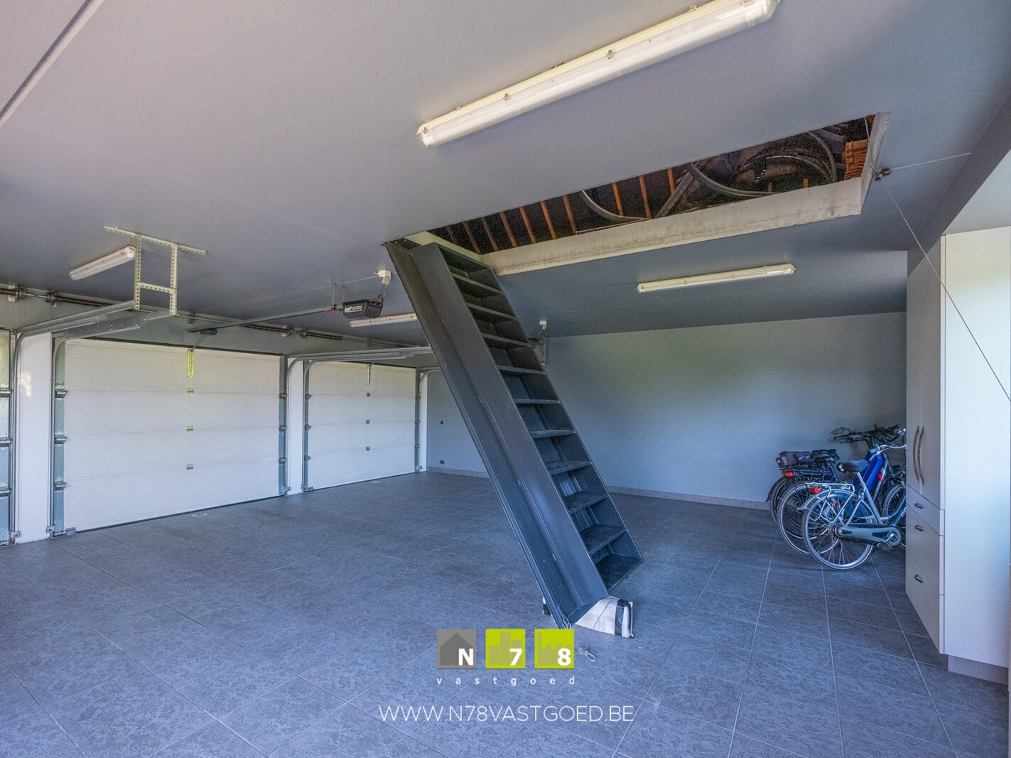 - Garage (74m²): automatisch te bedienen trap naar garage/zolderverdieping, maatkasten, lavabo, aparte zij-ingang, keramische tegelvloer.