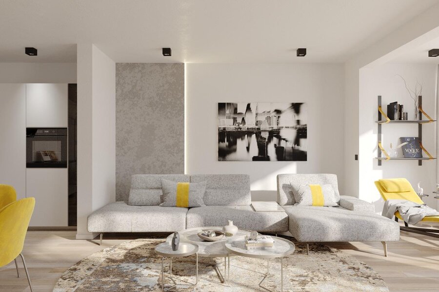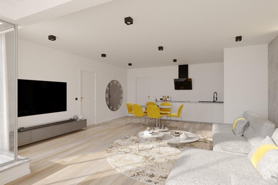 Bij binnenkomst wordt u meteen verliefd op de ruime leefruimte, die baadt in natuurlijk licht dankzij een volledig glazen zuidgerichte gevel. Deze open ruimte, bestaande uit de woonkamer, eetkamer en keuken, geeft uit op een prachtig terras van 20 m² met een adembenemend uitzicht.