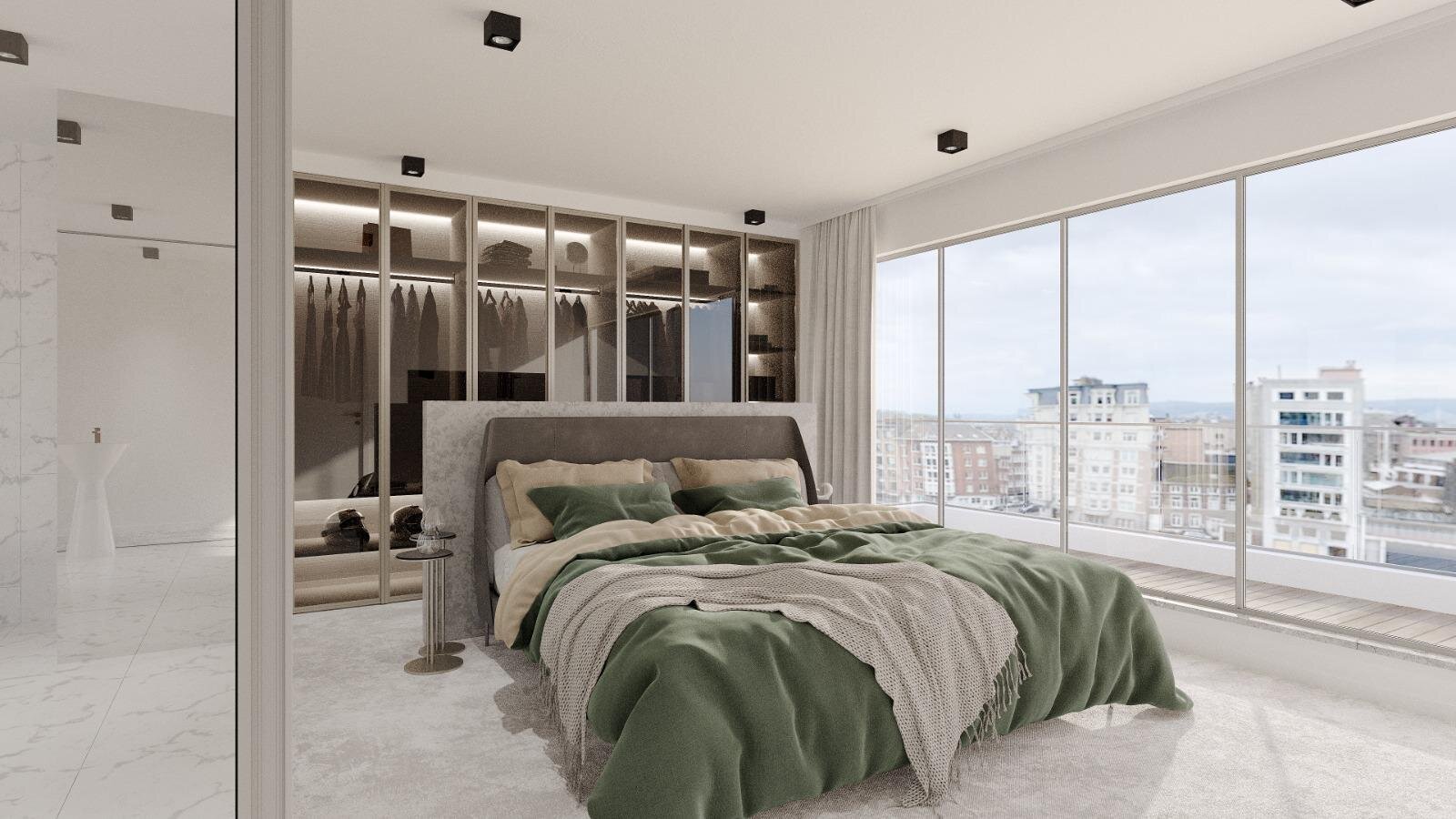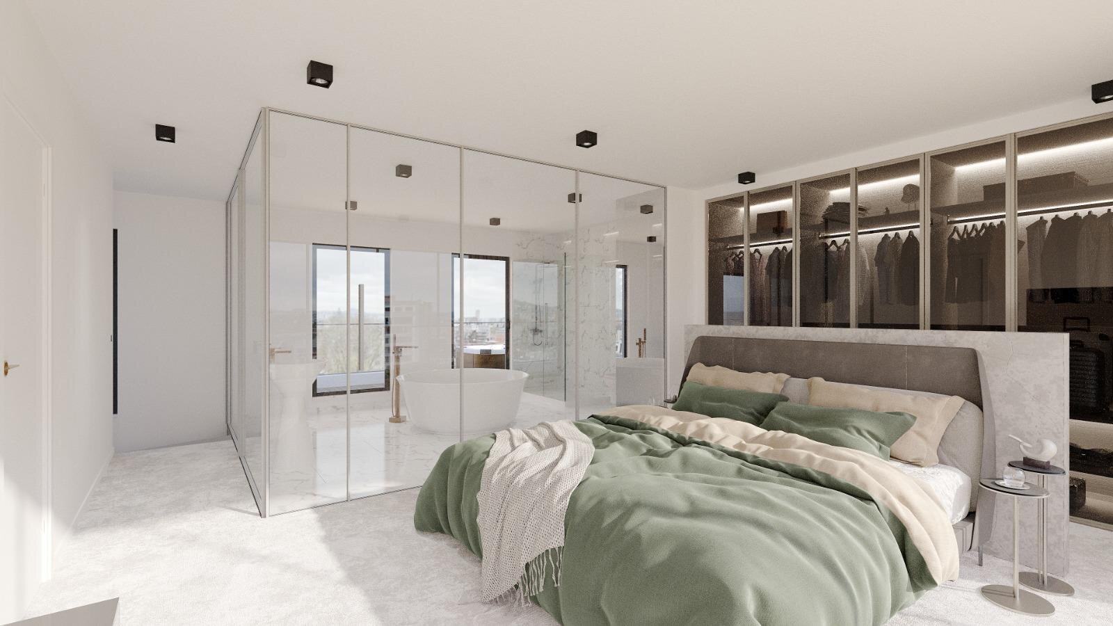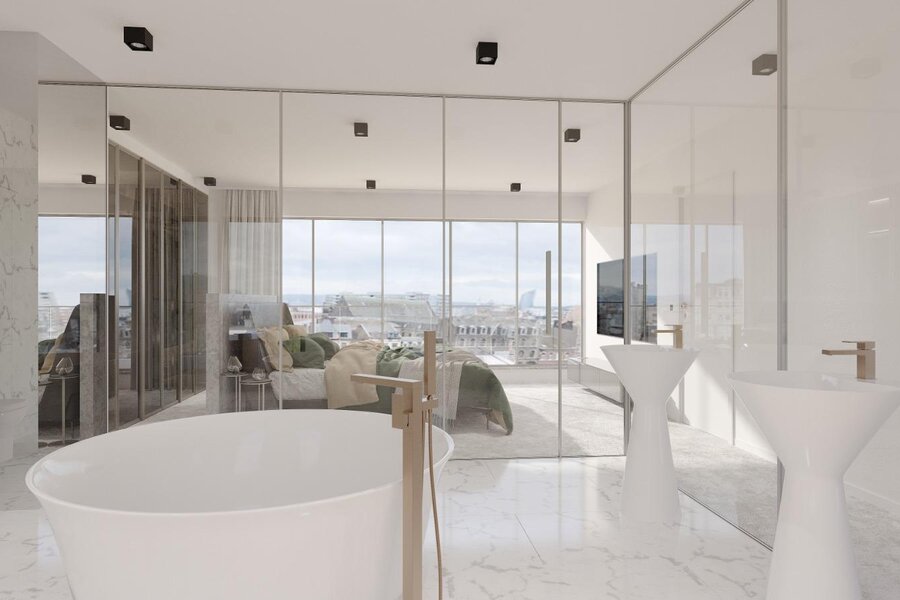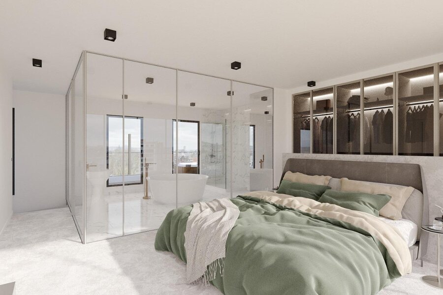Op de bovenverdieping is de tweede master slaapkamer een echte eyecatcher, met een op maat gemaakte dressing en een adembenemende glazen badkamer met ligbad en inloopdouche. Twee extra terrassen, aan de voor- en achterzijde, maken deze unieke ruimte compleet.