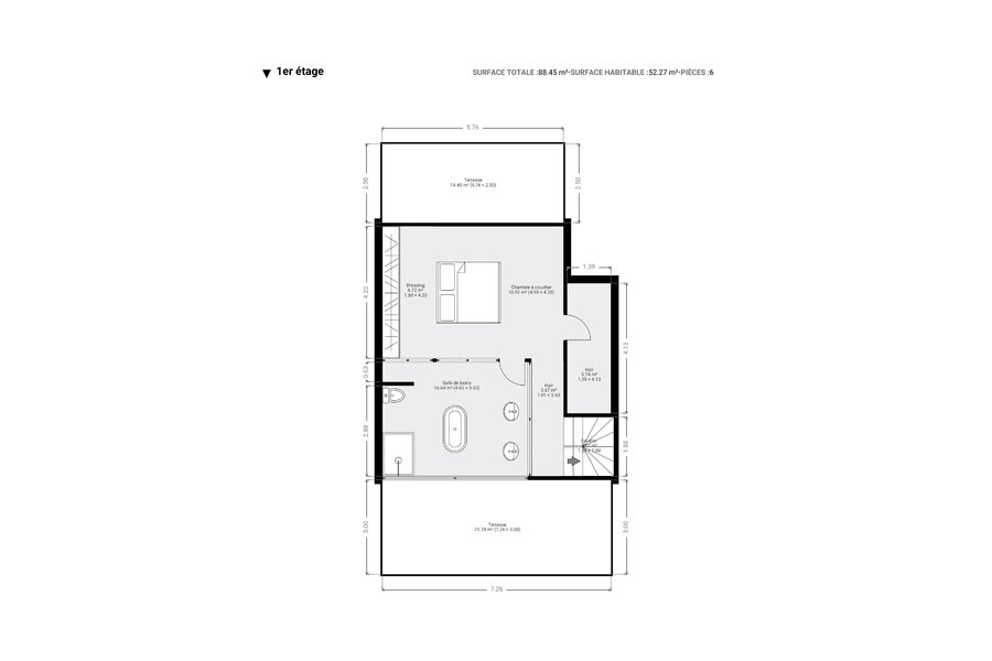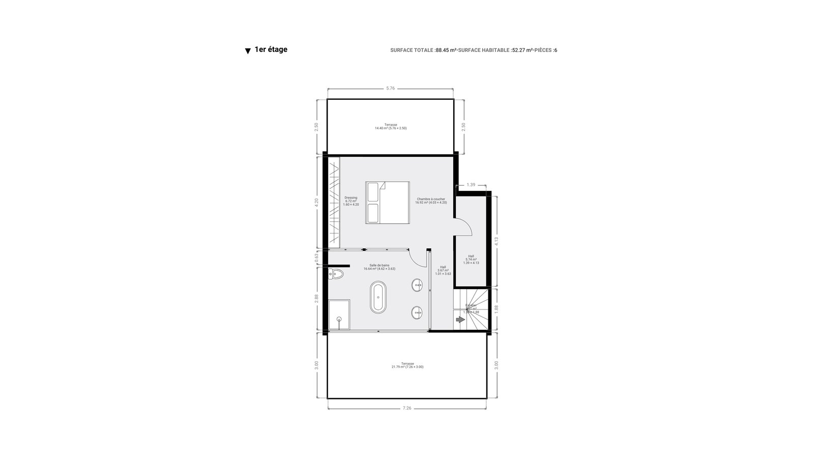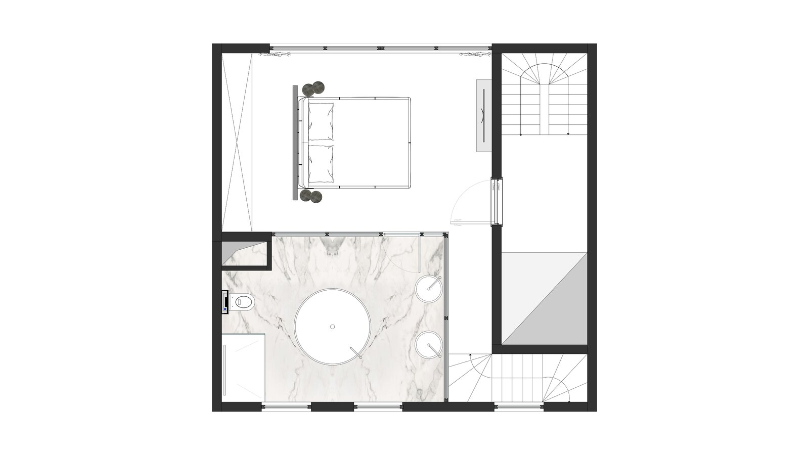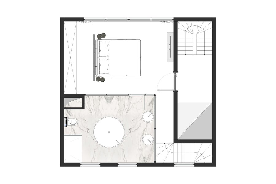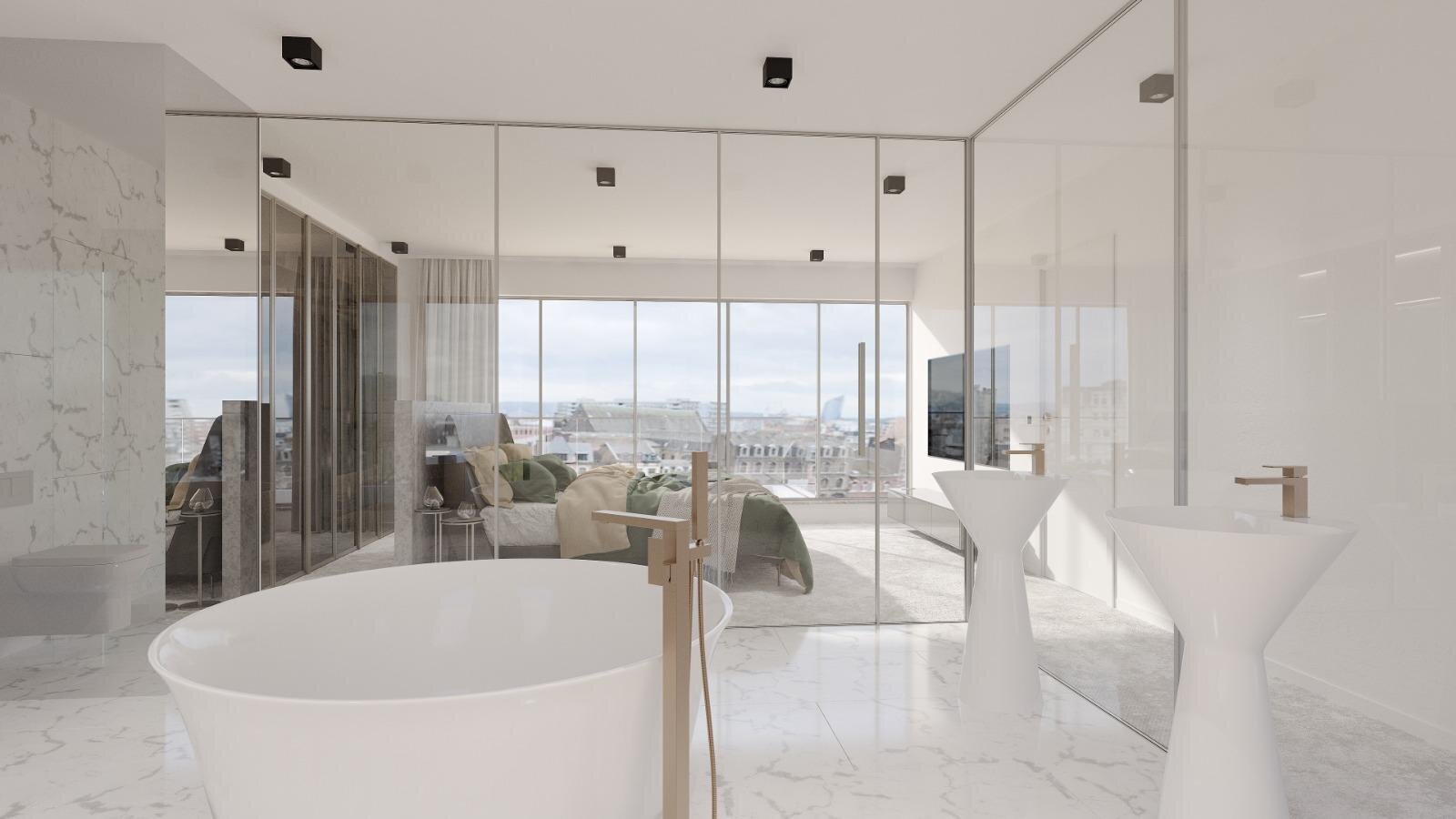 Op de bovenverdieping is de tweede master slaapkamer een echte eyecatcher, met een op maat gemaakte dressing en een adembenemende glazen badkamer met ligbad en inloopdouche. Twee extra terrassen, aan de voor- en achterzijde, maken deze unieke ruimte compleet.