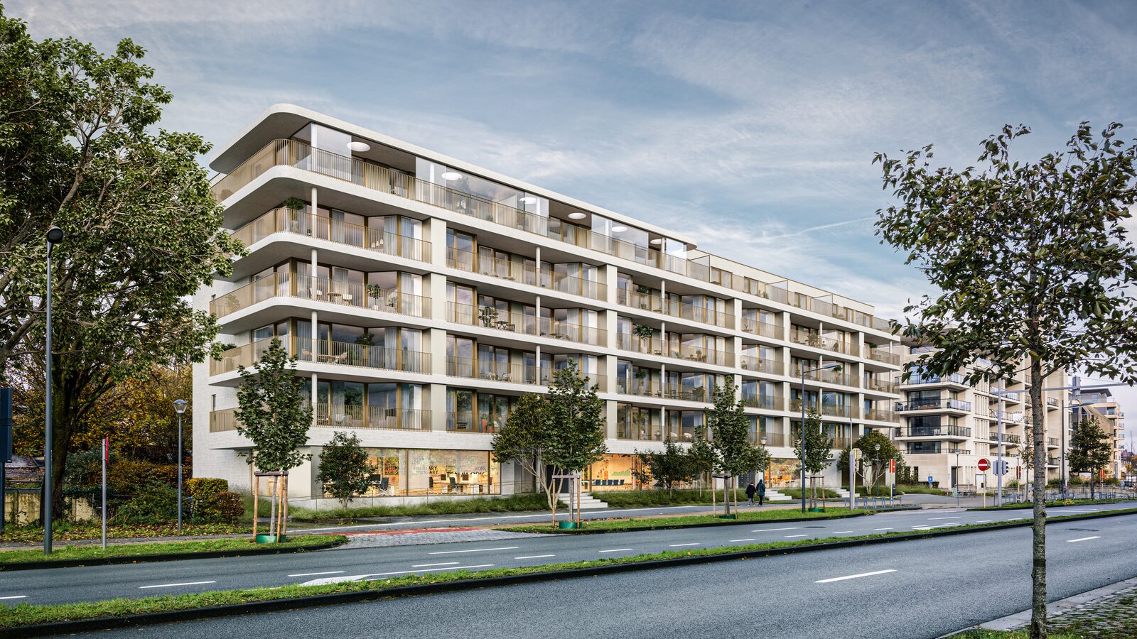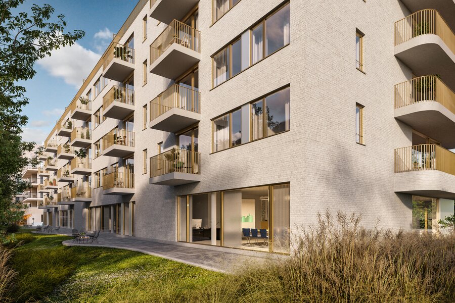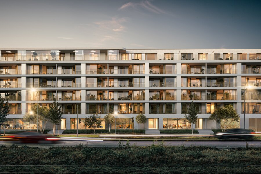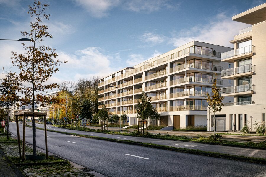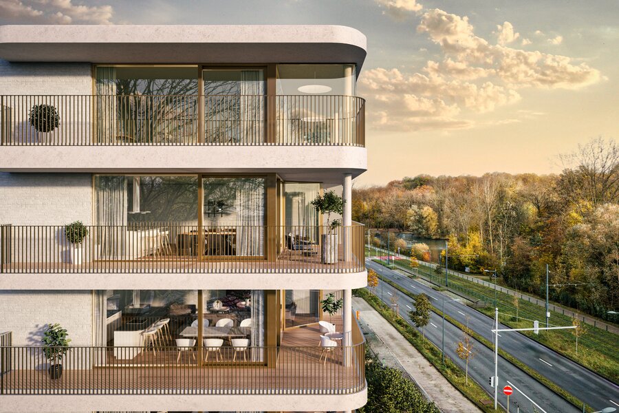 Part of the Woluxe project, this apartment meets the strictest energy standards and has been built with a strong focus on sustainability. The façades of this prestigious project combine durable materials, light tones, and elegance, with a harmonious blend of concrete, white bricks, and anodized bronze aluminum elements.