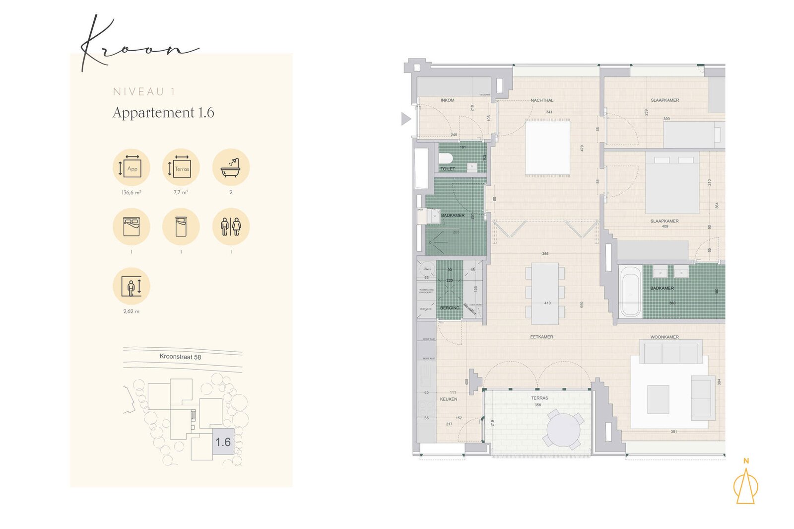 Je komt binnen via de inkomhal met gastentoilet, waarna een centrale hal toegang biedt tot twee ruime slaapkamers. De master bedroom beschikt over een en suite badkamer met bad en dubbele lavabo. Daarnaast is er een tweede badkamer met douche. De eetkamer, die aansluit op enerzijds de keuken en anderzijds de woonkamer, vormt het hart van het appartement. Vanuit hier heb je directe toegang tot het zuidgerichte terras. Een aparte berging naast de keuken zorgt voor extra opslagruimte of ruimte voor wasmachine en droogkast.