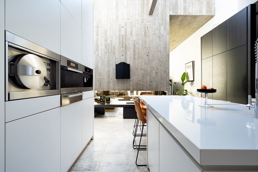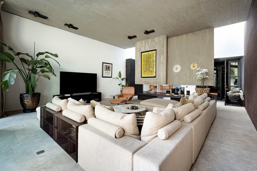 The ground floor comprises a spacious entrance hall, a contemporary and spacious living room with fireplace and access to the garden, a semi-open kitchen with island, and a spacious dining room. The first floor includes the master suite with fully fitted bathroom and en suite dressing room. The second floor includes three spacious bedrooms and a vast bathroom. The third floor accommodates a spacious and bright office with pantry and built-in cupboards. Furthermore, a guest room with en suite shower room. The fourth floor includes the sixth bedroom with bathroom. The minus one accommodates the wellness area with swimming pool, sauna, shower and fitness room. Access to the garden through garden stairs. The laundry room and technical room with storage are also located here.