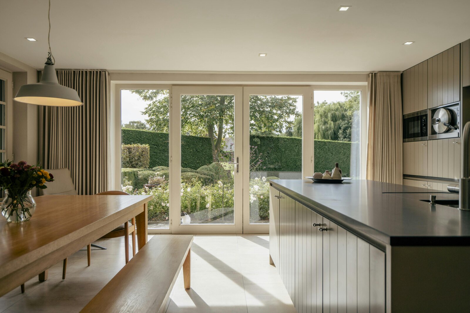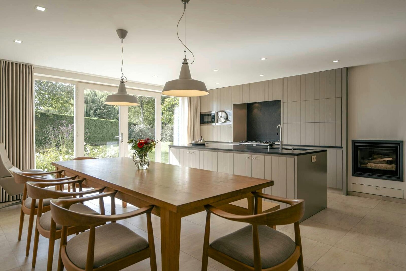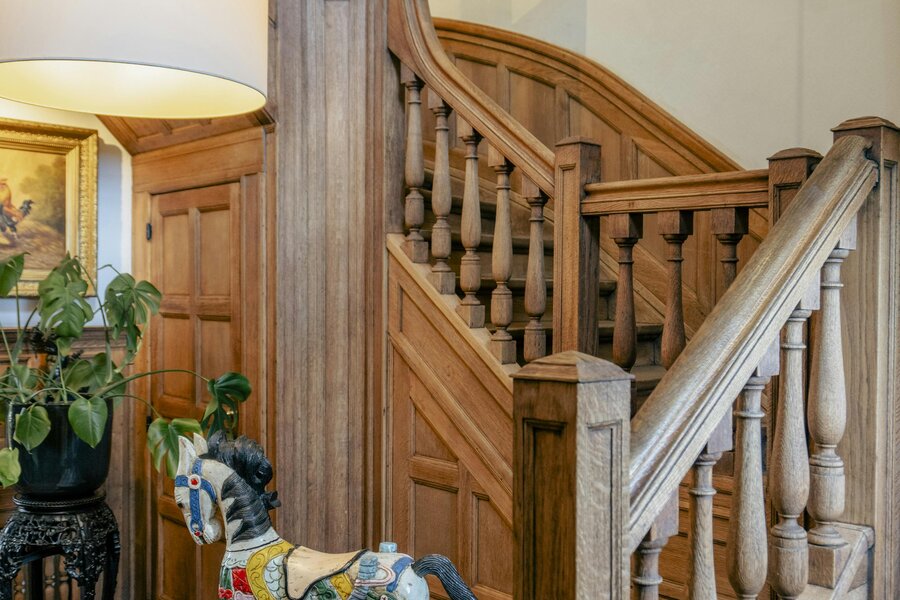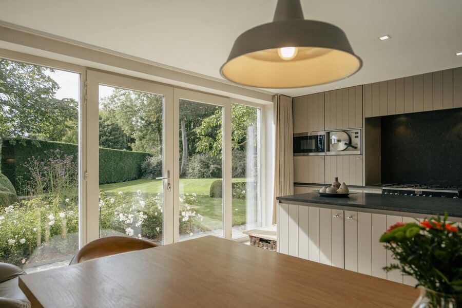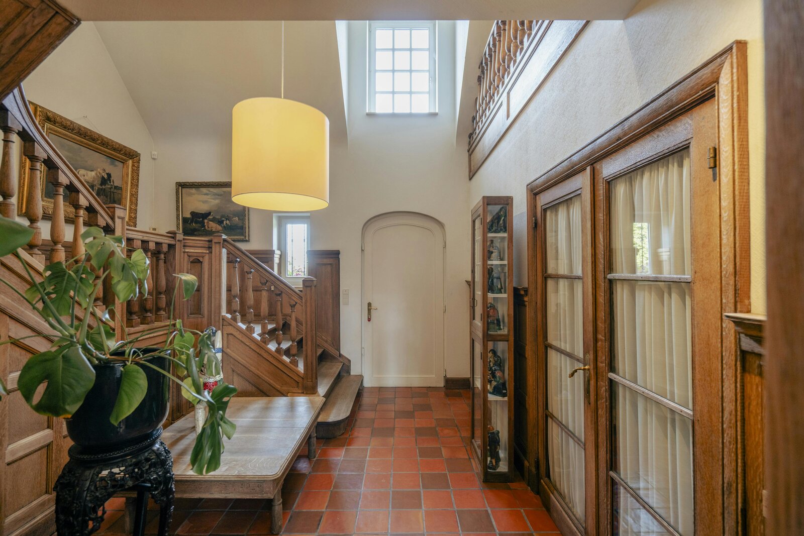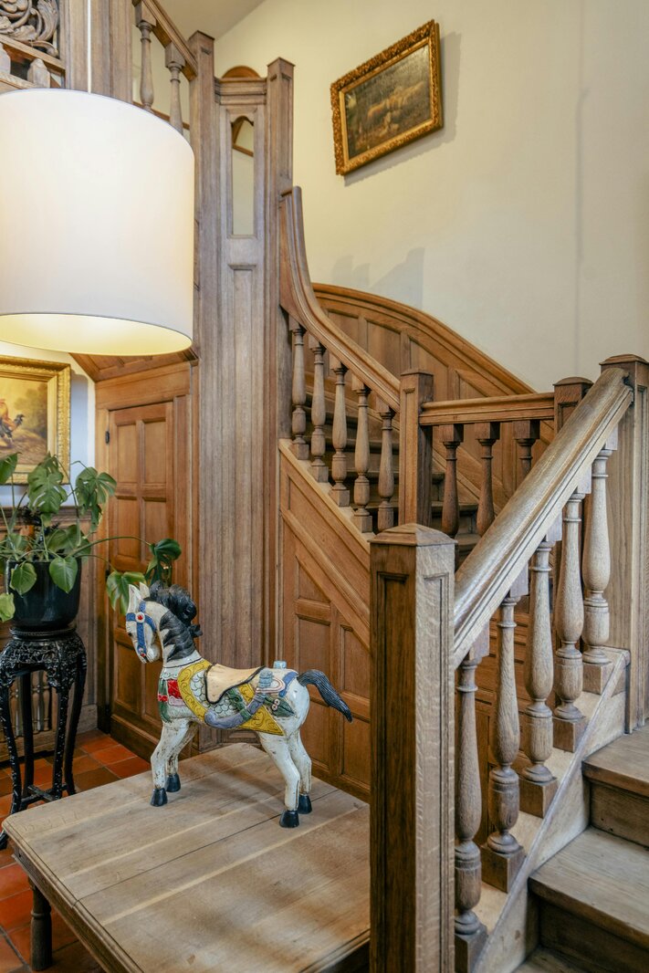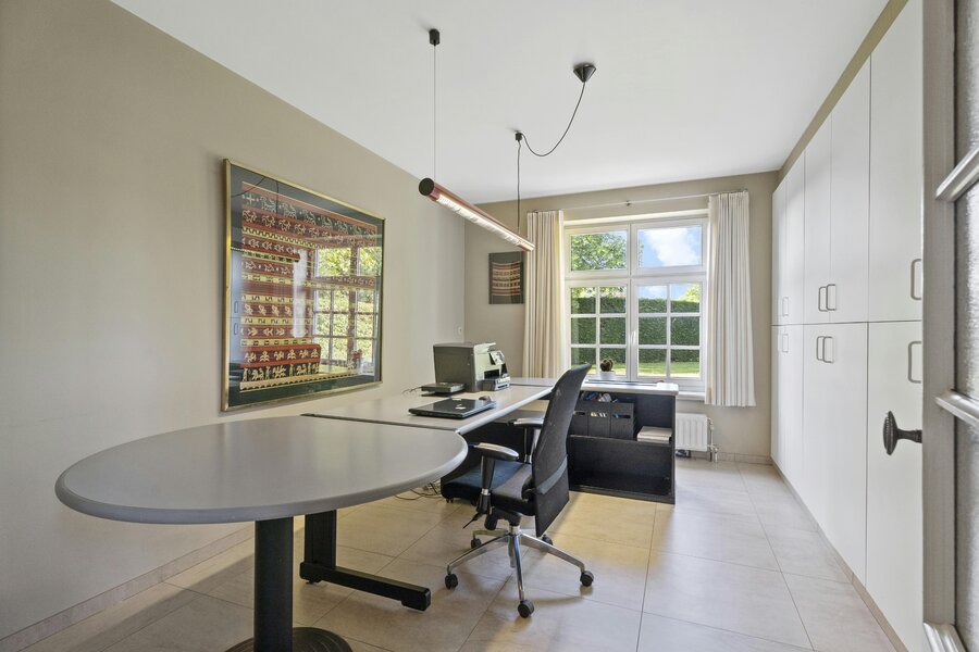 Spacious entrance hall with oak staircase with separate toilet and cloakroom - Charming living room with garden view - Luxurious country kitchen with all necessary comfort (Falcon gas stove with hood, microwave oven, steam oven, dishwasher, sink and American fridge) - Spacious office with built-in cupboards - Second entrance hall with toilet - Laundry room with shower - Utility room - Technical room and garage. Externally, you have access to an extra storage space, a second garage and an attic space.