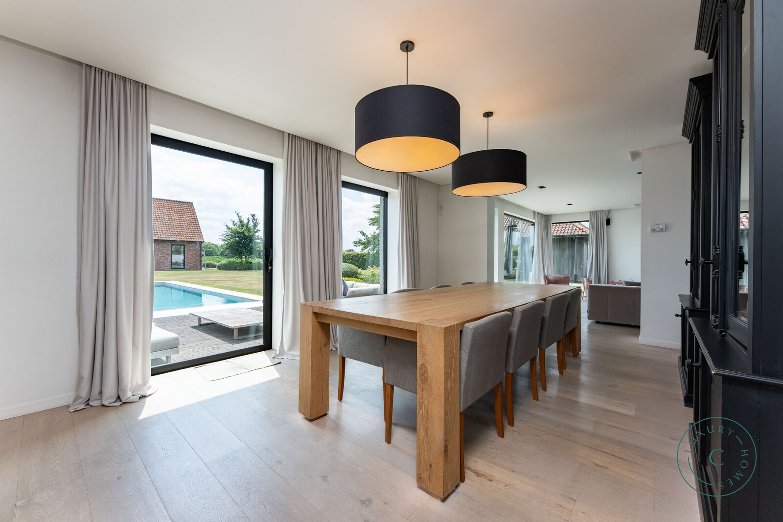 Via een statige oprijlaan met meerdere parkeerplaatsen bereik je de woning. De inkomhal geeft toegang tot de royale leefruimte, waar de leefkeuken met bijkeuken, eetplaats en gezellige zithoek één harmonieus geheel vormen. Naast de leefruimte bevindt zich verder een aangename bureauruimte die perfect kan dienst doen als extra leefruimte voor kinderen. Grote raampartijen zorgen voor veel natuurlijk licht en een rustgevend zicht op de prachtig aangelegde tuin, het zwembad en de stijlvolle bijgebouwen.