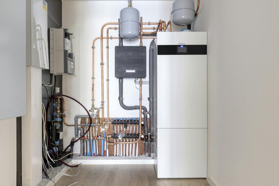 Thanks to an advanced energy concept — including a ground-water heat pump, floor heating with a cooling option, solar panels, automatic sunscreens and custom cabinets — you can enjoy a sustainable and luxurious indoor climate here. The expected E level of -2 underlines the excellent energy efficiency of this home.