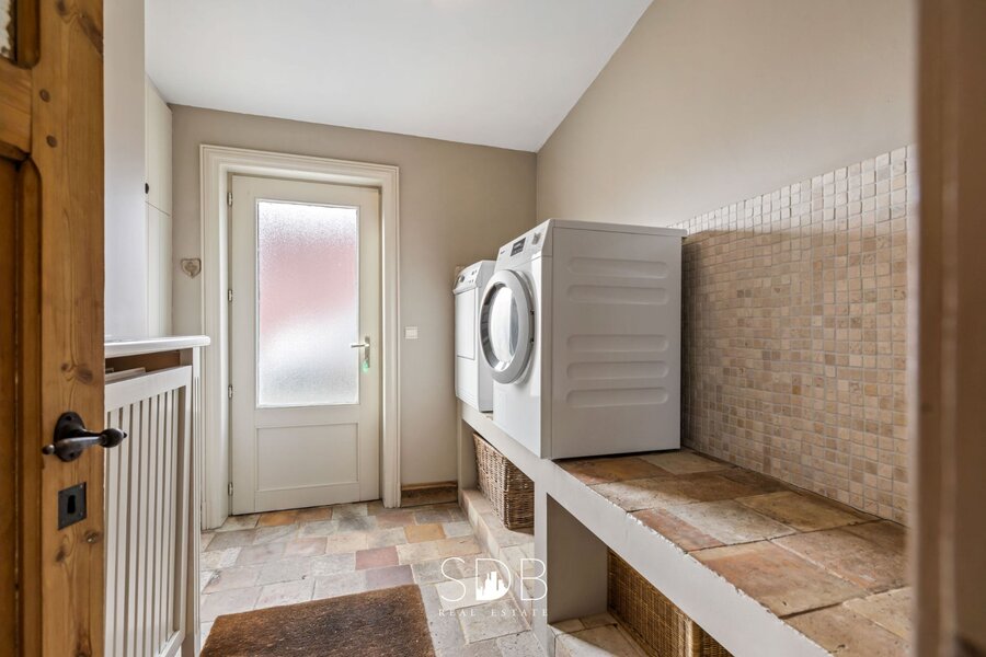 Praktische Berging: Aansluitend een berging met alle nutsvoorzieningen voor wasmachine en droogkast, plus ruime opbergmogelijkheden.