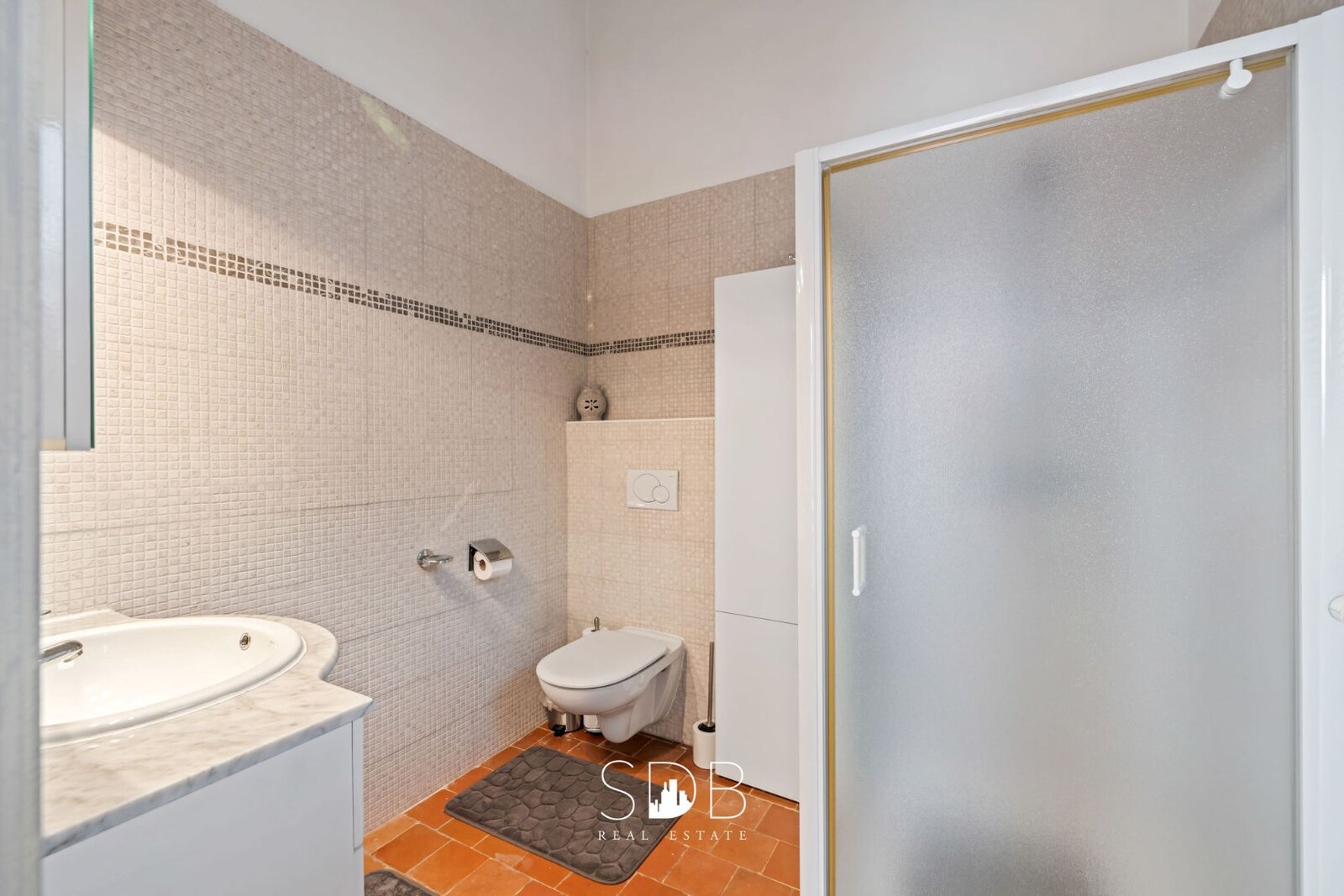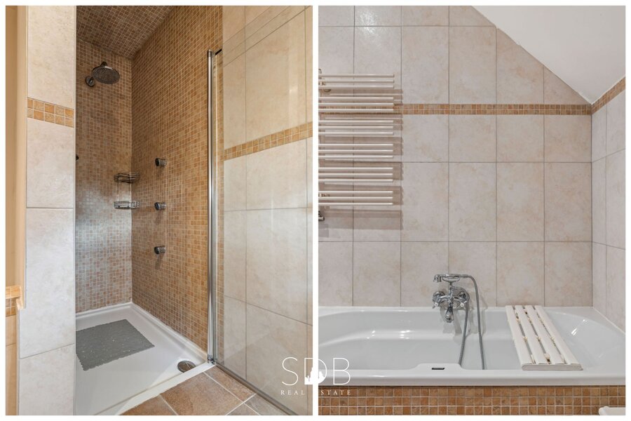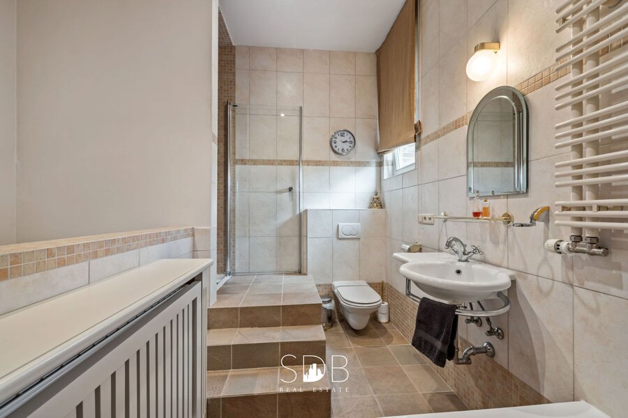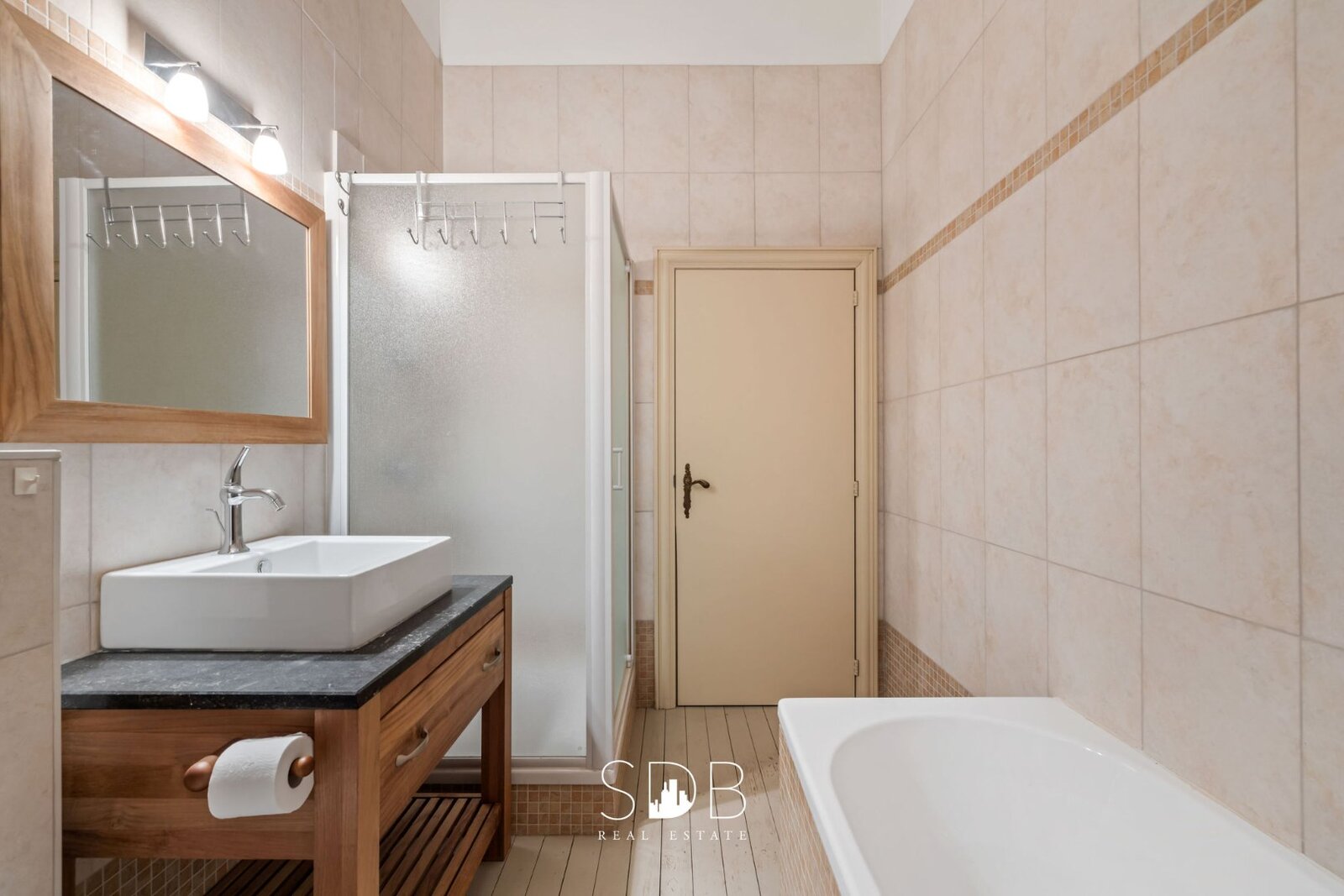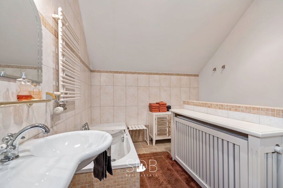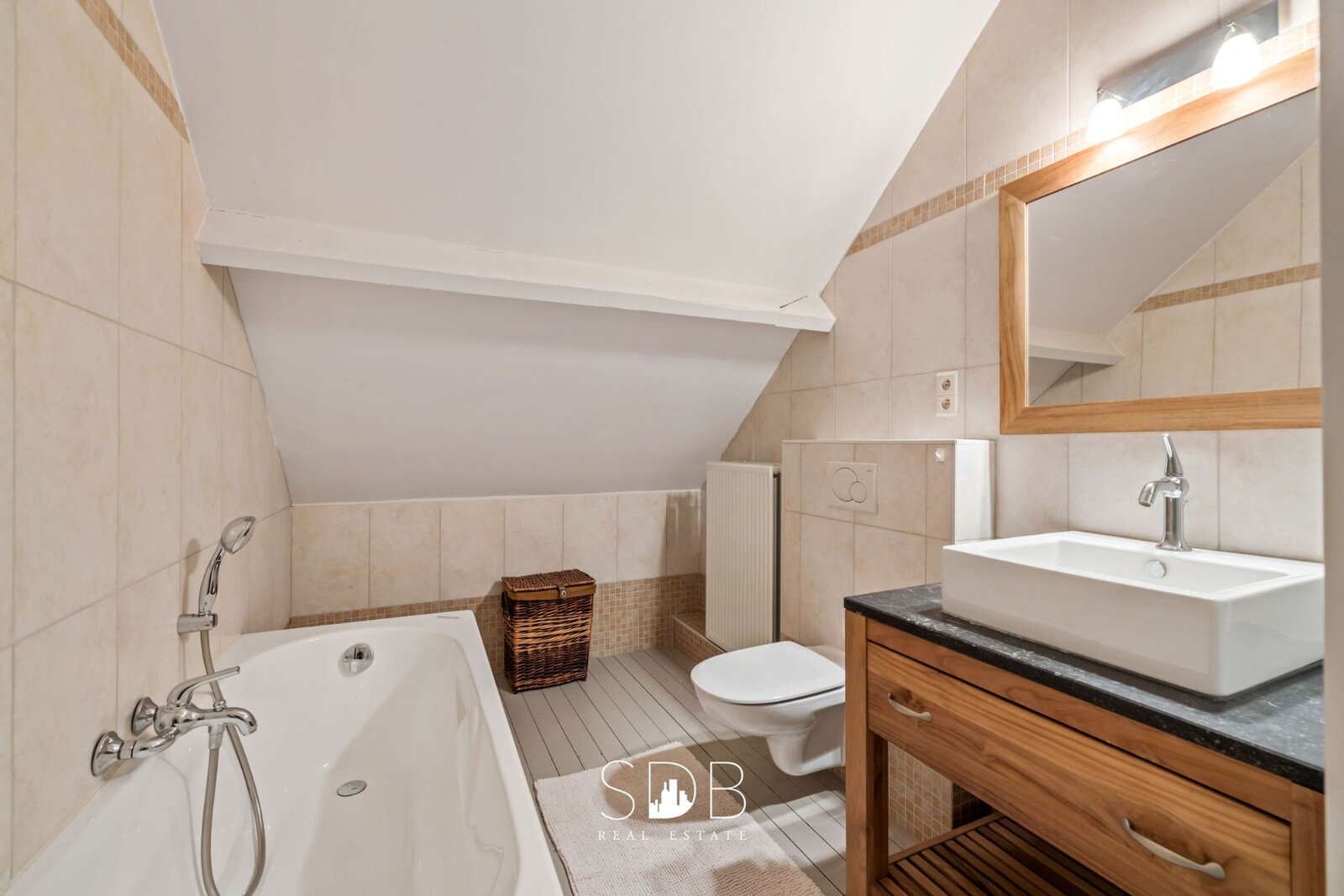 Gelijkvloers: Een volwaardige slaapkamer met bijhorende dressing op de benedenverdieping. Eigentijdse Badkamer : Uitgerust met enkel lavabomeubel, ligbad, douche en toilet.