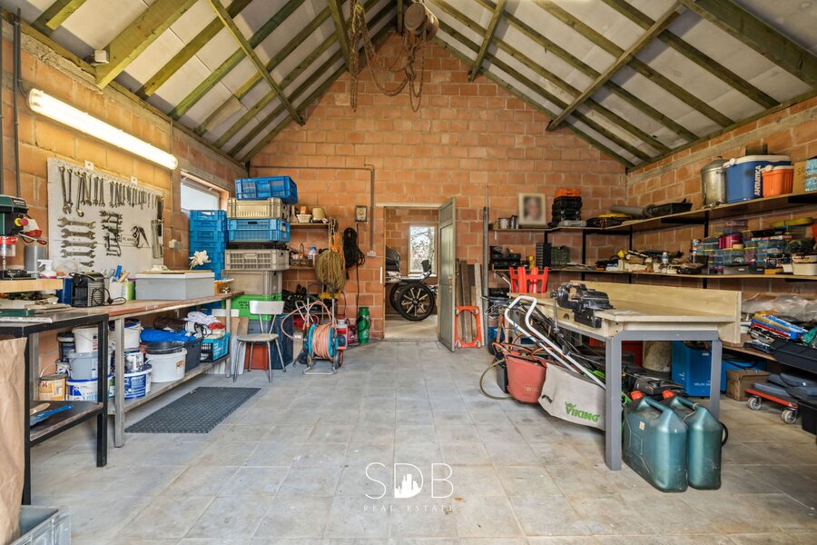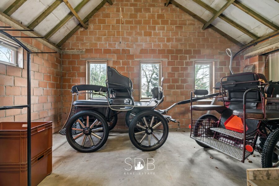 Het 1ste bijgebouw telt een opp. van 77,14m². Een merkelijk mooie ruimte naar opslag toe. Dit doet momenteel dienst als werkplaats en opslag voor koetsen maar is vrij in te delen naargelang je voorkeuren.