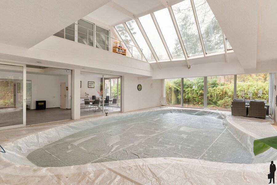 - Leefruimte (ca. 53m²) met gezellige zitkuil met open haard op gas. Grote schuifdeuren naar het aan de living grenzende zonneterras. Met behoud van alle privacy is gebruik gemaakt van grote raampartijen welke zorgen voor bijzonder veel lichtinval en zicht op de tuin. Het zwembadgedeelte (ca. 120m²) is open tot in de nok, met twee praktische omkleedruimtes.
