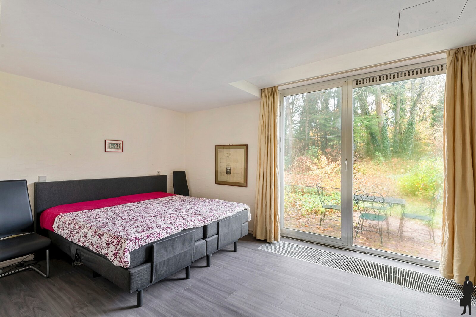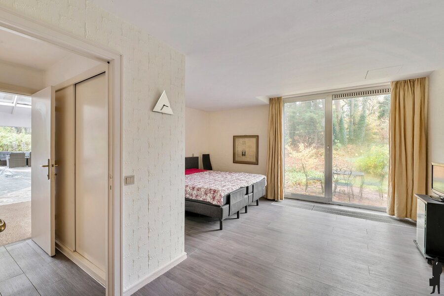 - Van hieruit toegang tot de het logeergedeelte, bestaande uit een slaapkamer (ca. 20m²) via een hal met apart toilet en ingemaakte dressingkasten.