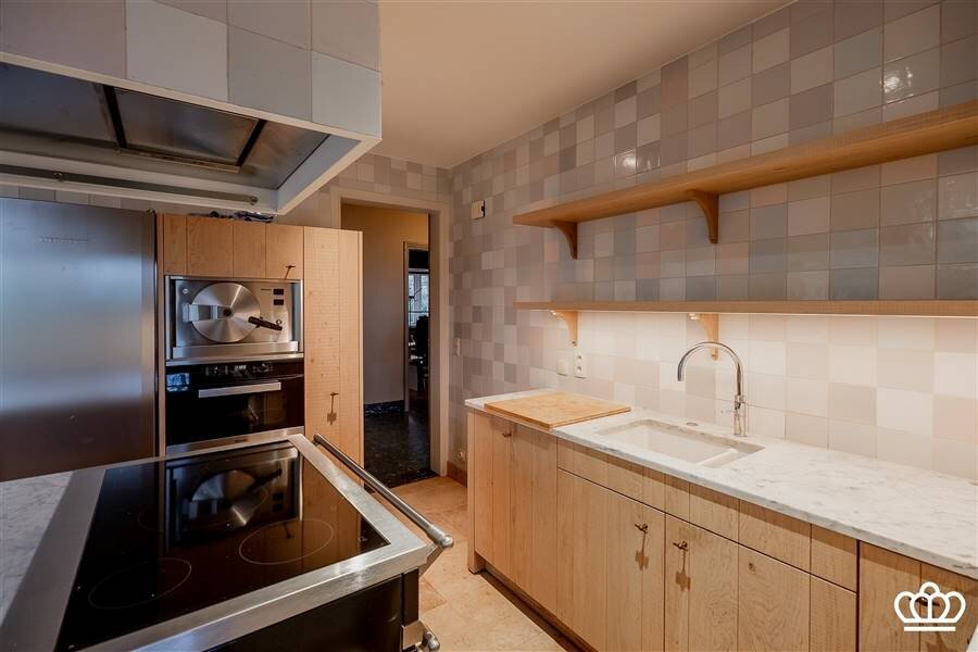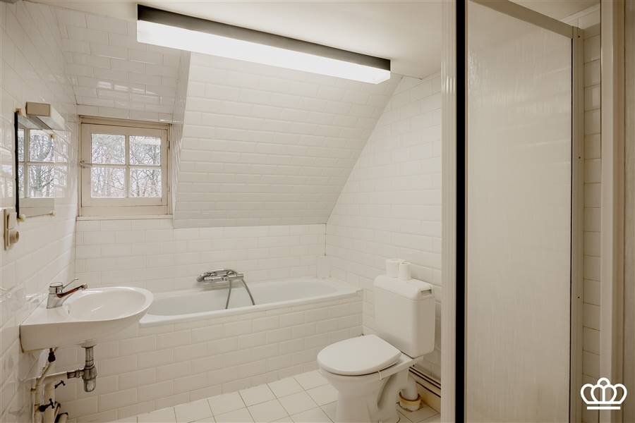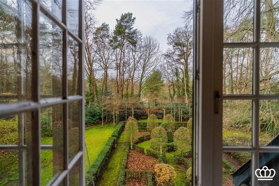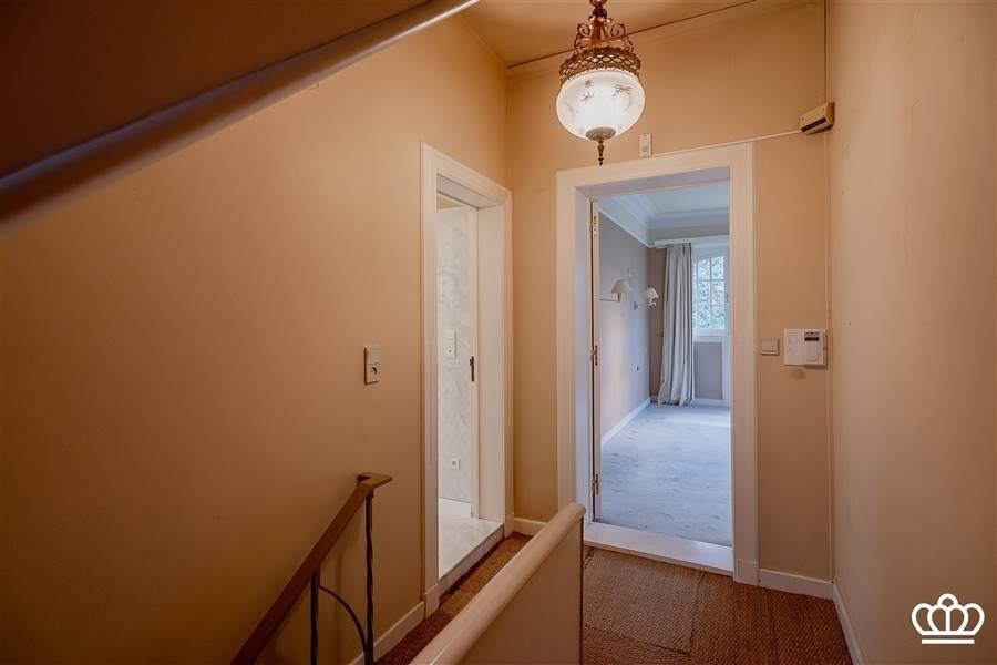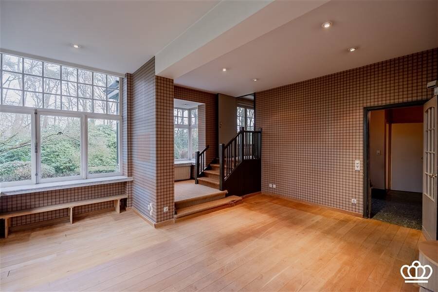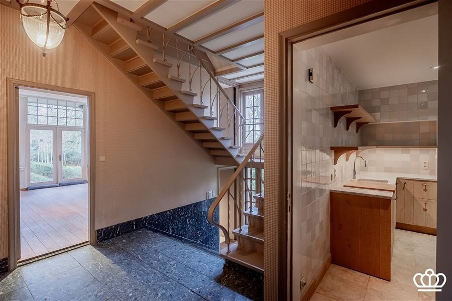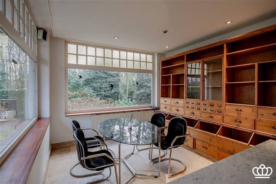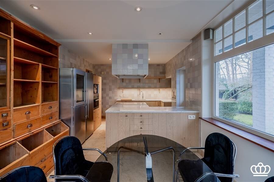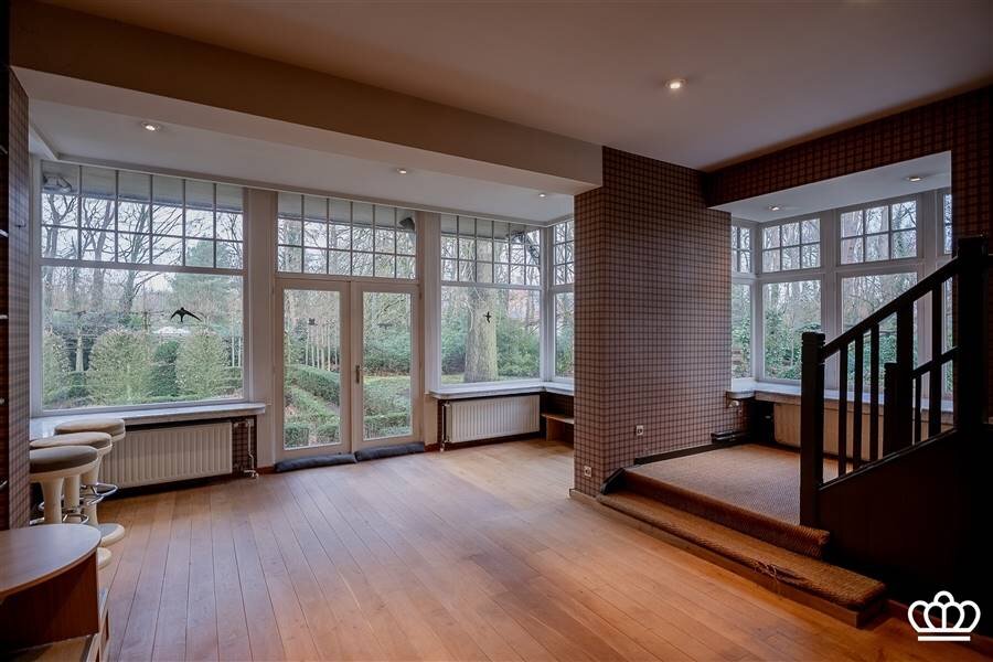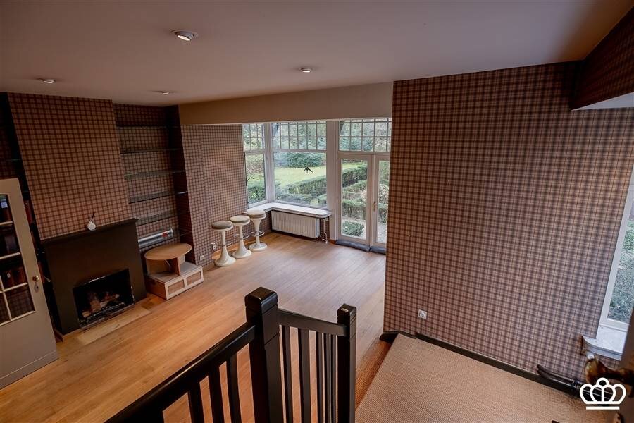 Entrance hall, living space divided into a sitting area on parquet floor with cosy bay windows, fireplace with authentic mantelpiece and paneling, followed by a dining area on mosaic floor and a garden room. 2nd lounge (or office) with fireplace and built-in cupboards and nice view over the garden. Living kitchen with built-in appliances and cozy dining area.