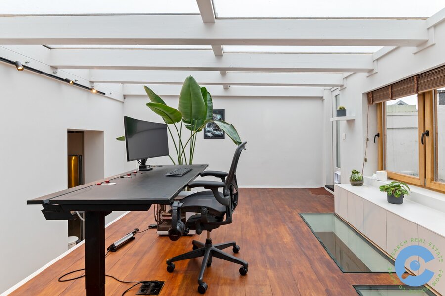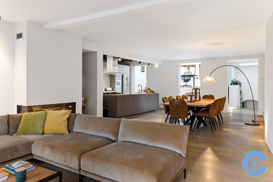 De open leefruimte ademt een uniek loftgevoel en baadt in natuurlijk licht. Een sfeervolle gashaard en een luxueuze open keuken met kookeiland en high-end afwerking vormen het hart van de woning. Aansluitend zijn er twee open ruimtes, momenteel ingericht als home office, die perfect kunnen dienen als slaapkamer.