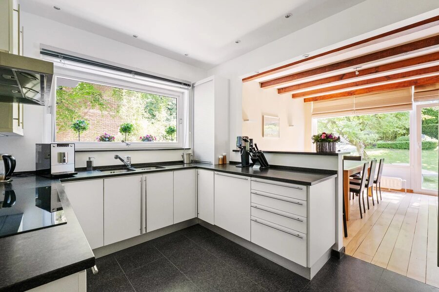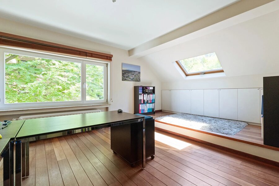 Woluwe-Saint-Pierre: Victoire - Junot exclusively presents this spacious villa (340m² of living space) in perfect condition, located in a quiet and very residential area close to Place Dumon. It is built on a 10 South-facing plot with a swimming pool. On the ground floor: entrance hall, cloakroom, guest toilet, reception rooms with parquet flooring and open fireplace, dining room with access to BBQ terrace and swimming pool, fully equipped open-plan American kitchen, master suite with dressing room and bathroom (bathtub, shower, sink, toilet).