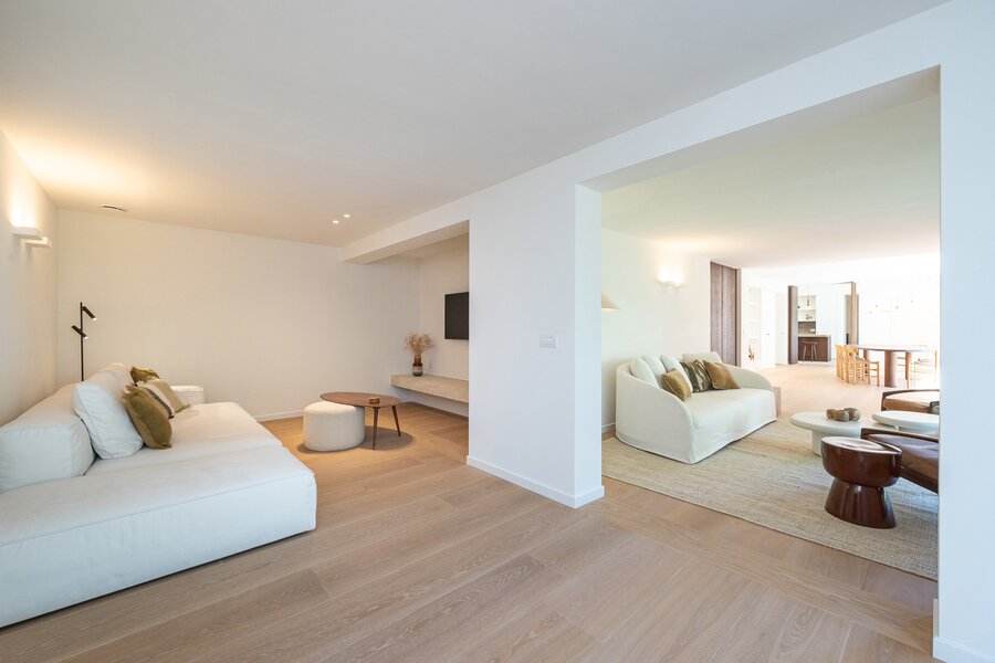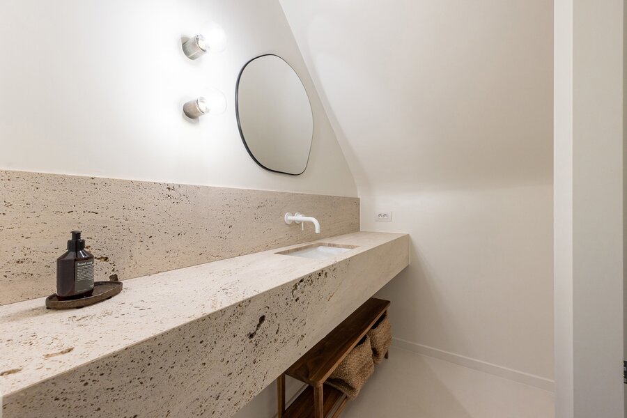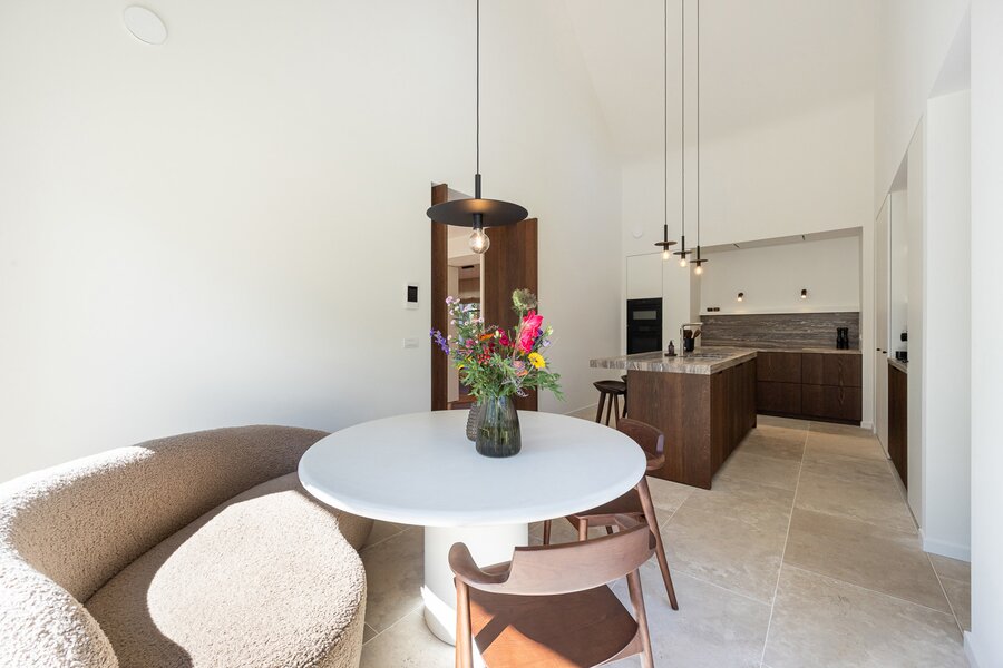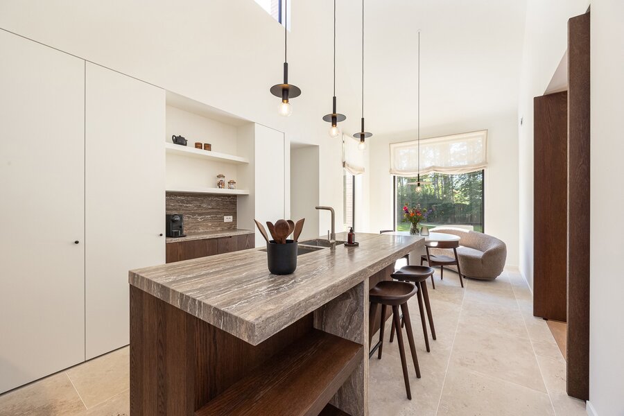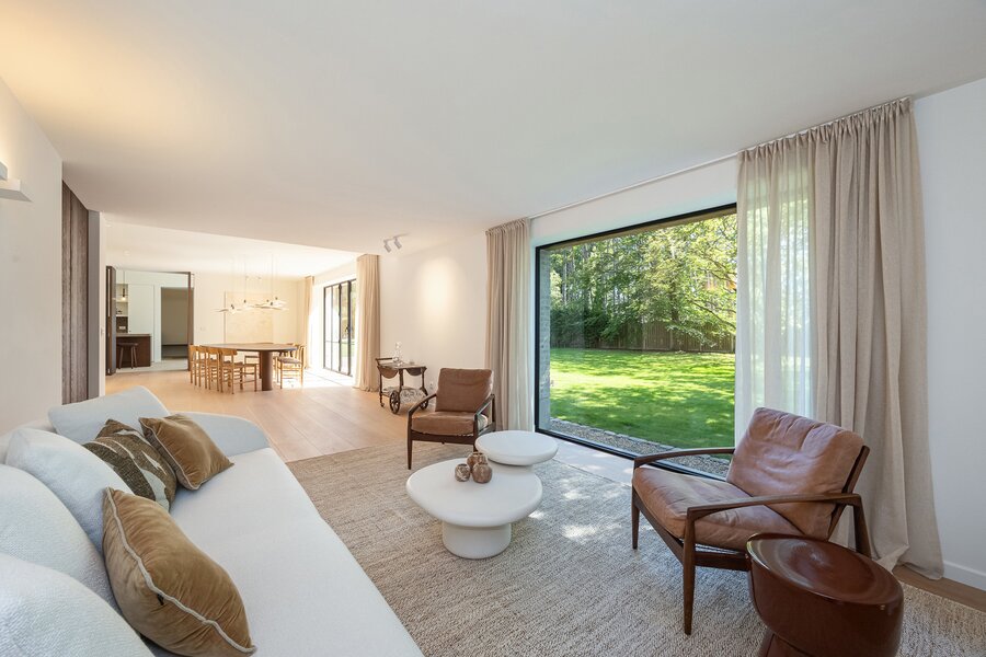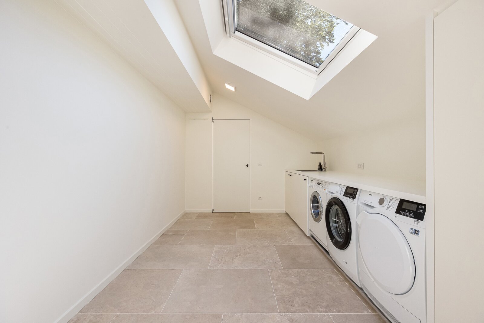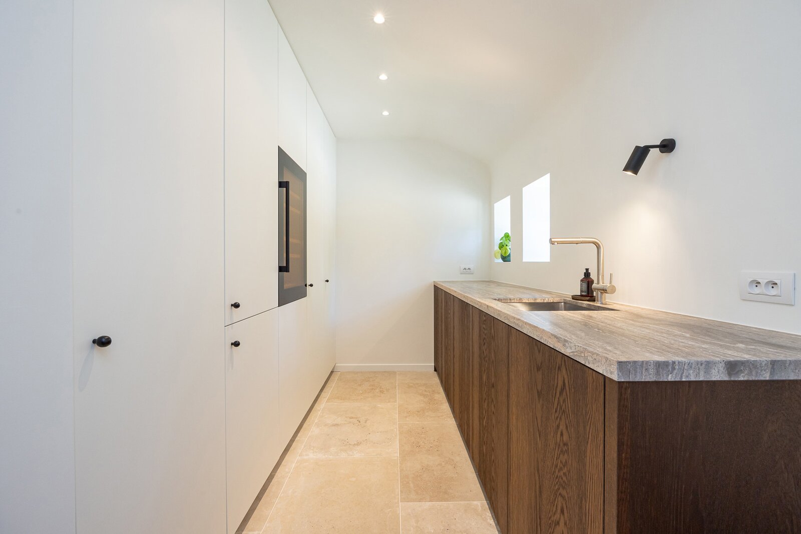 De leefruimte van 50 m² op parket biedt een fraai uitzicht op de tuin, alsook een tv-meubel in travertin en vele maatkasten. De volledig uitgeruste keuken van 33 m² op travertin sluit naadloos aan op de leefruimte en bijkeuken van 9 m² met travertin werkblad, diepvriezer, koelkast, spoelbak en wijnkoeler. De praktisch ingerichte wasplaats van 19 m² is voorzien van ingebouwde kasten en een uitgietbak. Daarnaast bevindt zich een technische ruimte van 8 m².